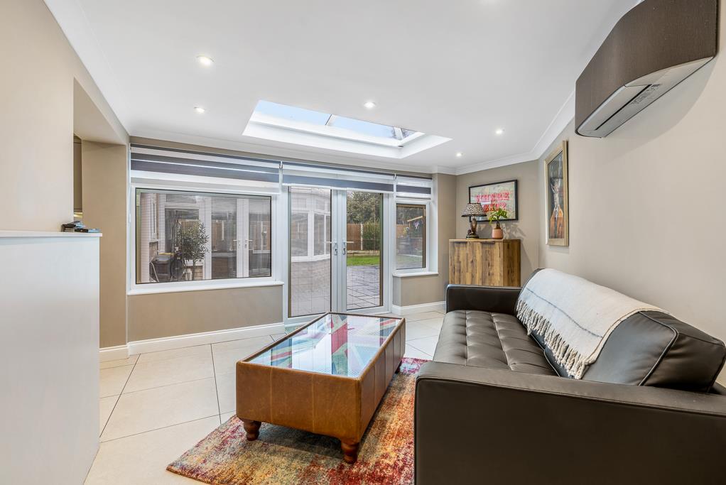 PVC double glazed windows and French doors opening to garden. Coving to skimmed ceiling and recessed spot lighting. Glazed ceiling lantern. Tiled flooring. Vertical column radiator. Air conditioning unit.