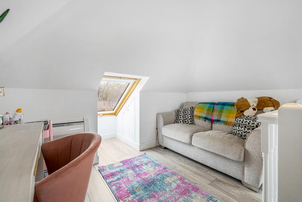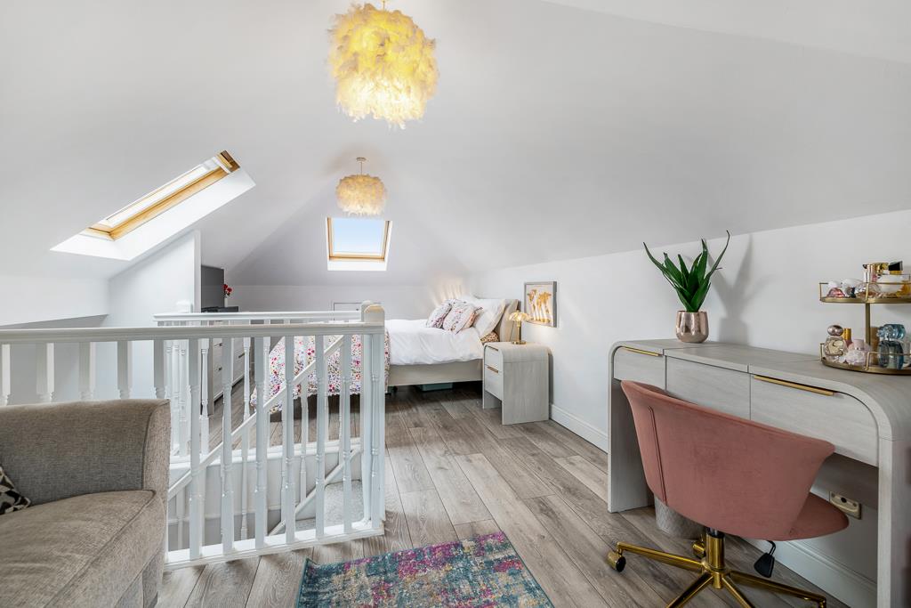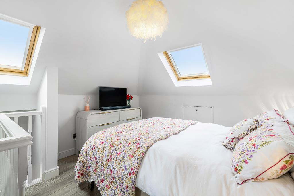 Three Velux windows. Skimmed and vaulted ceiling. Laminate flooring. Wall mounted air conditioning unit.