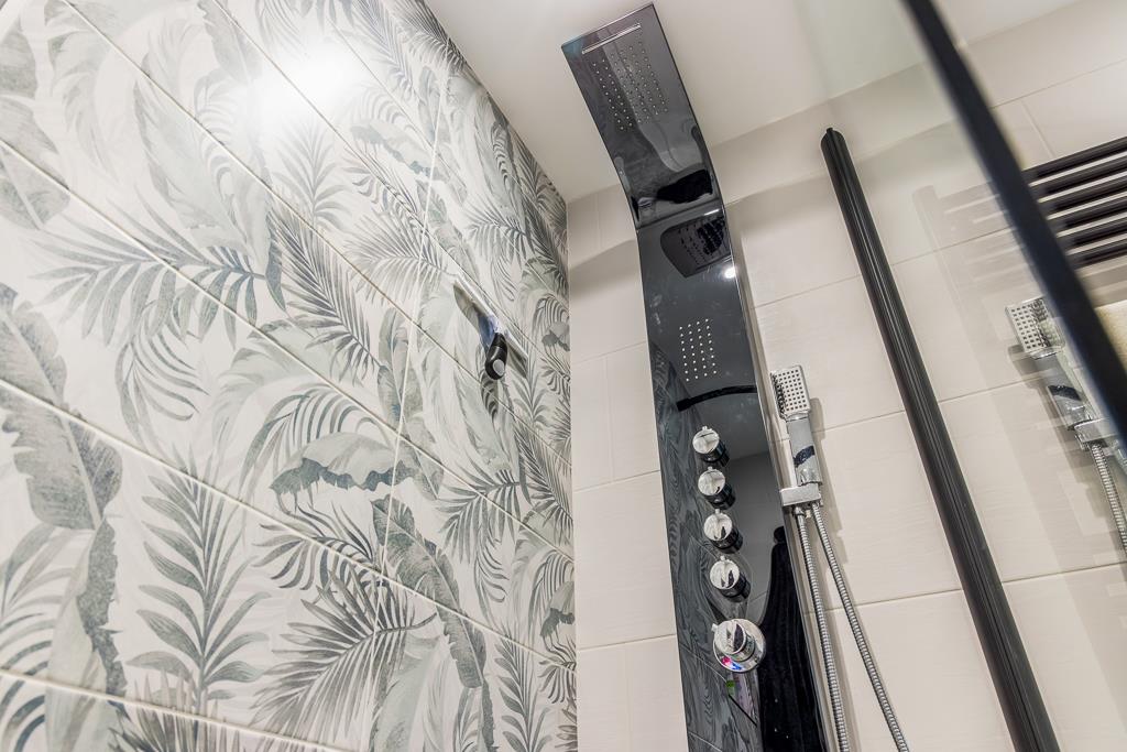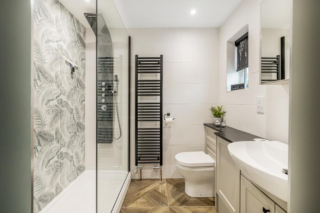 PVC double glazed window to rear. Skimmed ceiling with recessed spot lighting. Extractor fan. Tiled flooring. Wall mounted central heated towel rail with electric override. Fitted wall mounted illuminated vanity cabinet. Fitted panel bath with chrome mixer tap, built in mirror/TV. Mains Mira ceiling mounted shower with rainfall head and hand held attachment. Wash hand basin with chrome mixer tap and concealed cistern toilet set in vanity unit with built in storage. Under floor heating.