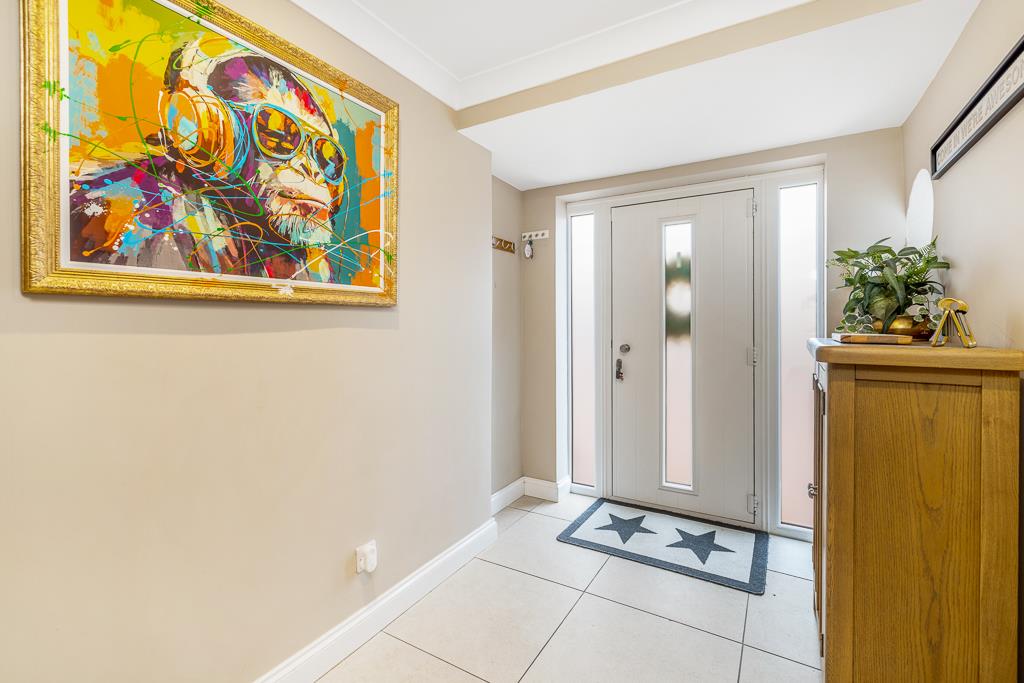 Composite glazed entrance door with glazed side panels. Port hole window to side. Tiled flooring. Stairs to first floor landing with built in under stairs storage. Vertical column radiator. Doors to lounge and kitchen.