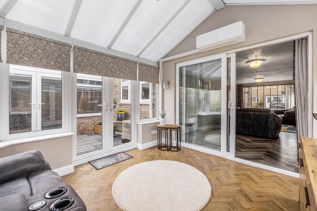 Brick and PVC construction with poly carbonate roof. Ceiling light/fan. Herringbone LVT flooring. French doors opening to garden. Air conditioning unit.