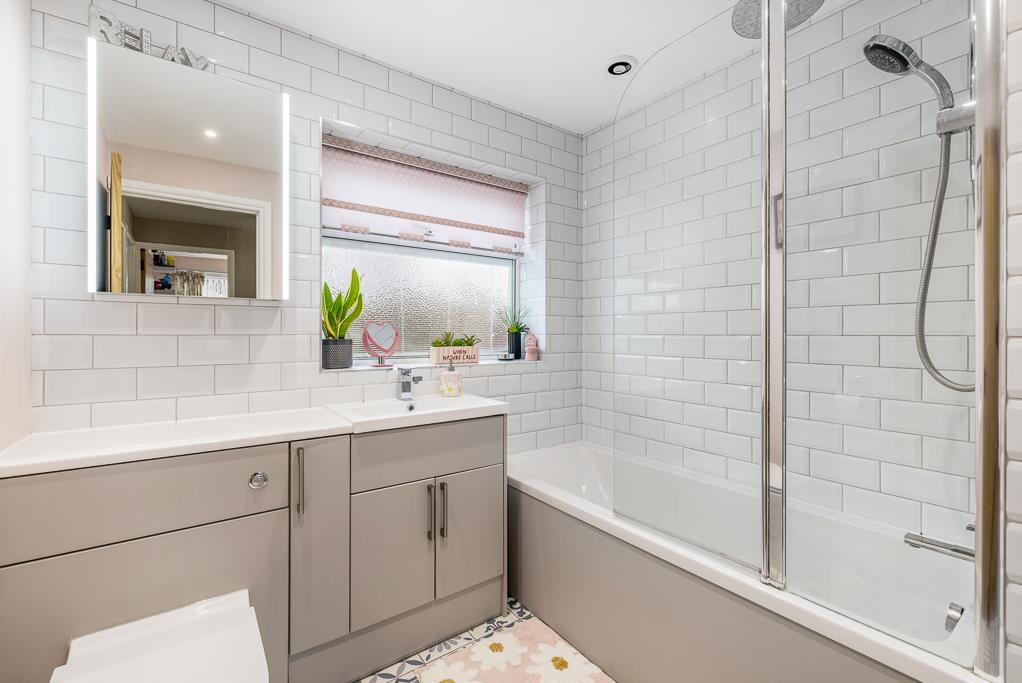 PVC double glazed window to rear. Skimmed ceiling with recessed spot lighting. Extractor fan. Tiled flooring. Full height wall tiling. Shaver point. Wall mounted mirrored vanity cabinet. Wall mounted towel rail with electric override. Fitted with a three piece suite comprising oversized walk in shower enclosure with mixer shower and hand held attachment. Wash hand basin with mixer tap. Concealed cistern toilet with built in vanity unit with storage.