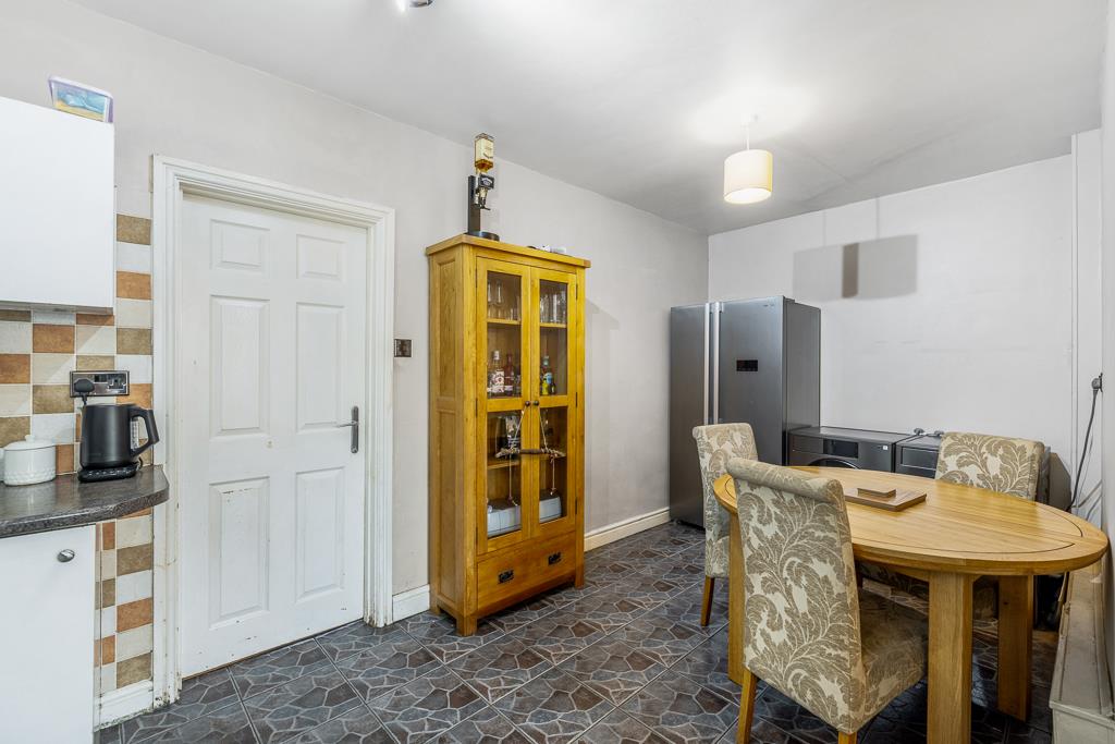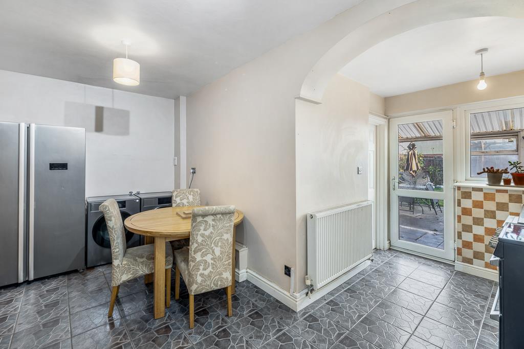UPVC double glazed window and door leading into the rear garden. A matching range of fitted base and wall units with work surface over. Stainless steel sink unit with mixer tap and tiled splash backs. Space for free standing cooker. Space and plumbing for washing machine. Space and plumbing for dishwasher. Space for fridge/freezer. Radiator. Tiled flooring.