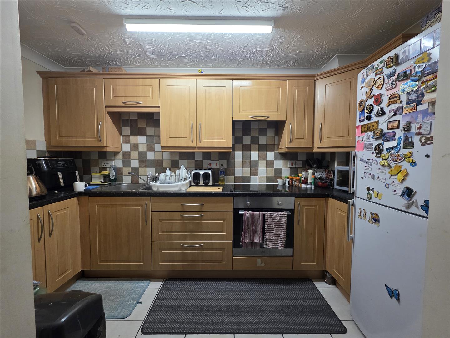 Matching range of base and eye level units with work surfaces over. Sink unit with drainer and mixer tap. Tiled splash backs. Electric hob with extractor hood over. Built in oven and grill. Space for fridge/freezer. Tiled flooring.