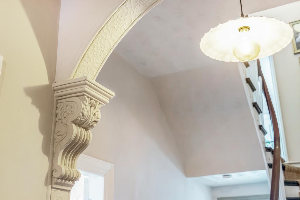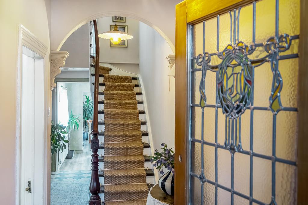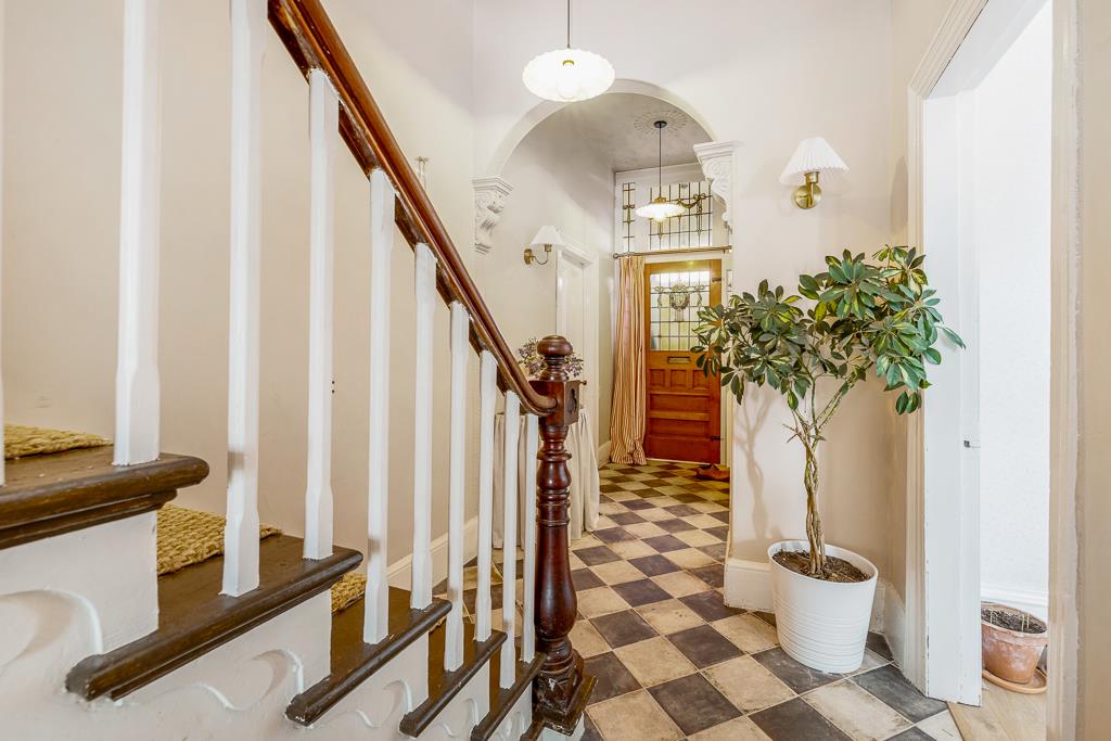 Stepping through the yellow door you are welcomed into a porch, with the original stained glass inner door retained, a lovely nod to the home’s heritage. This leads into the beautiful entrance hall, where the chequered tiled floor, winding staircase, and architectural corbels immediately set the tone and showcase the period charm throughout.