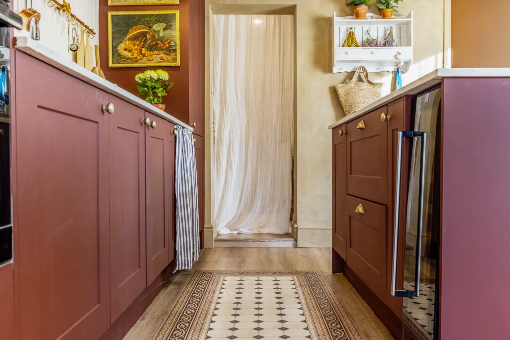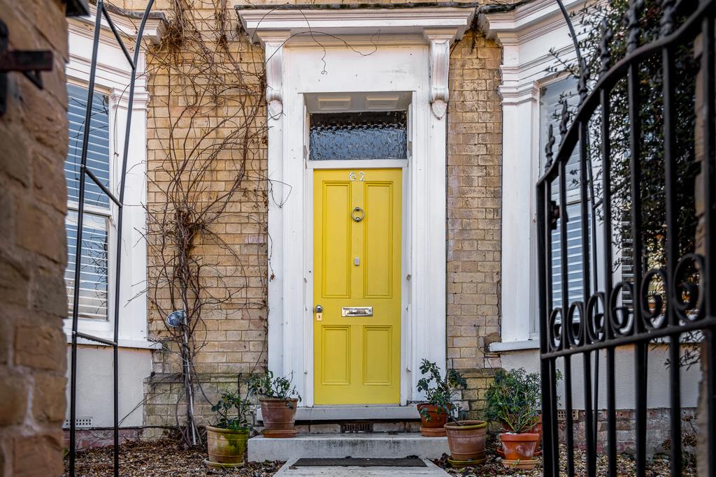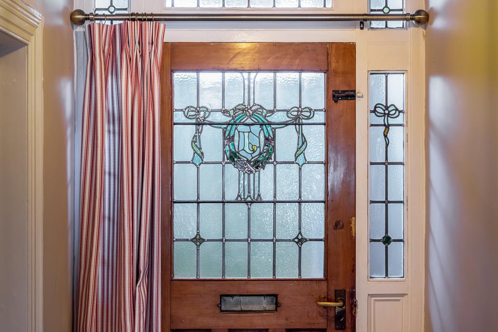 Brightly coloured wooden door to front to make this house really pop with window above. Original chequered tiled flooring.