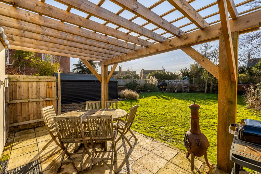 Outside, a spacious driveway leads to gated fencing separating the parking area from the rear garden. The generous rear garden is a fantastic blank canvas for keen gardeners, featuring a pergola and patio area ideal for entertaining, plus a larger-than-average shed.