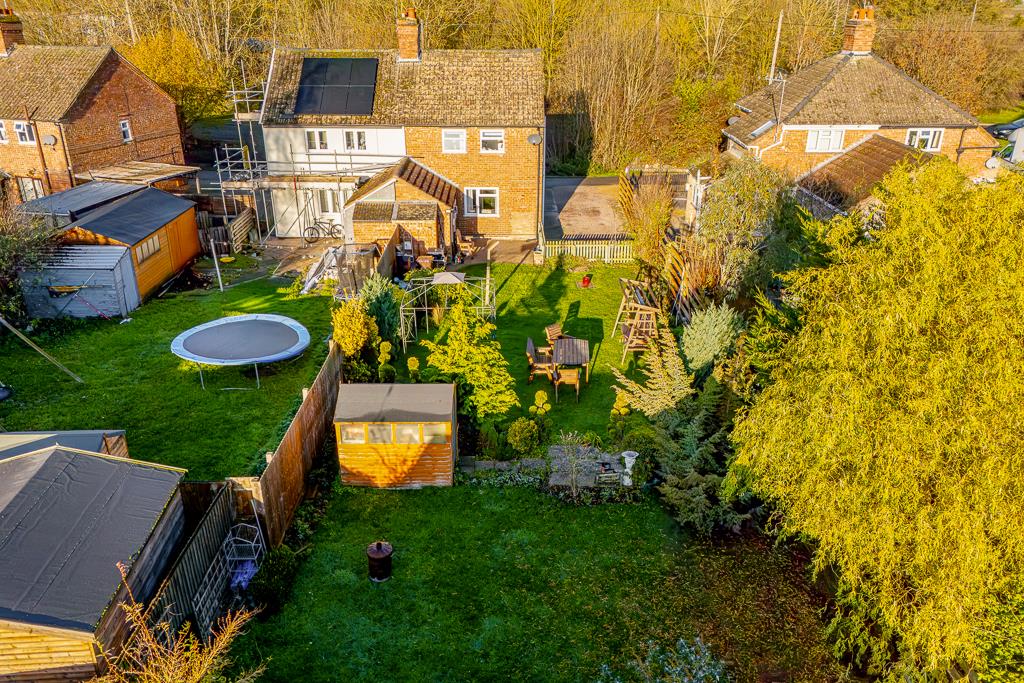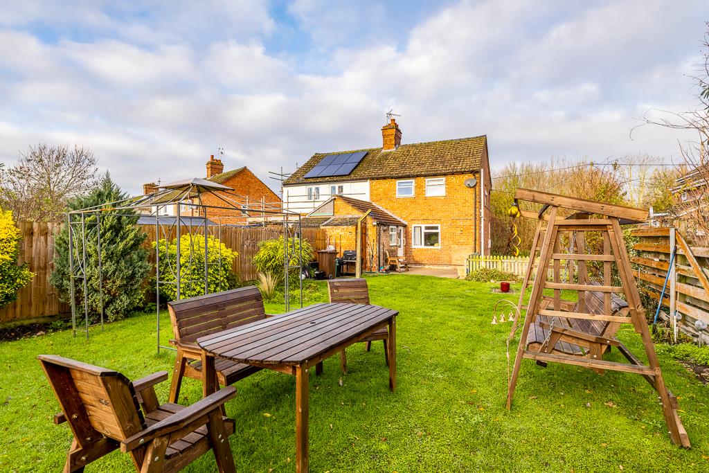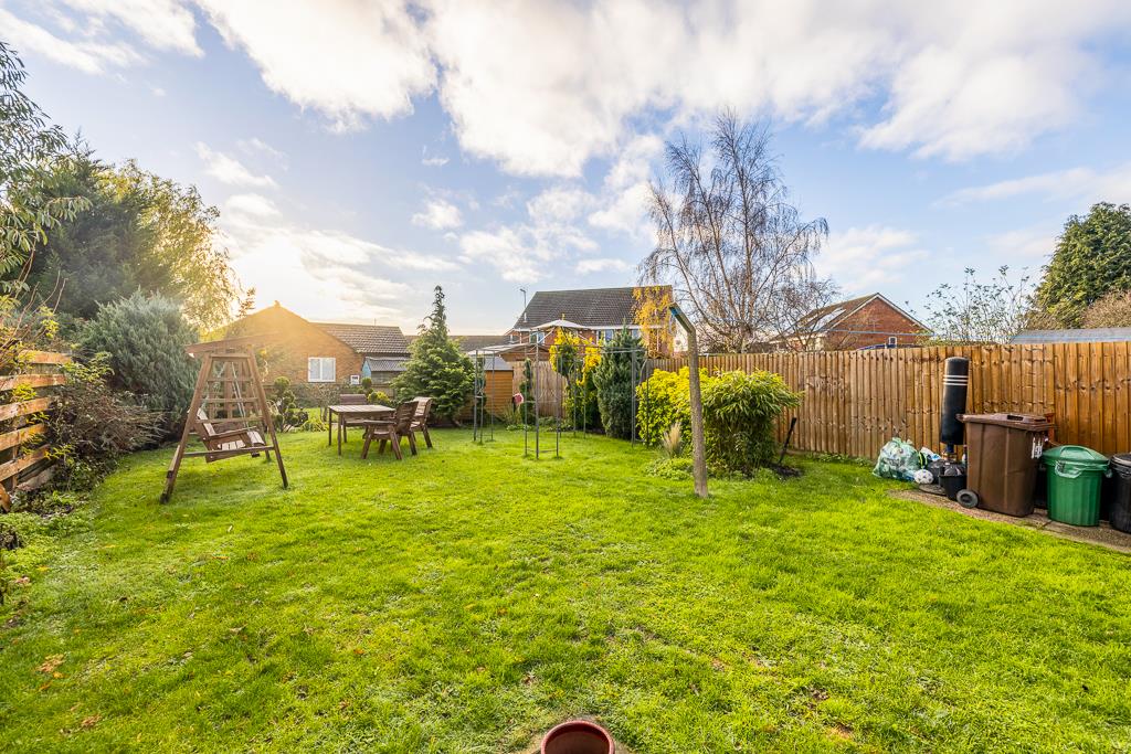 The rear garden is enclosed by timber fencing. Lawn area. Patio area.