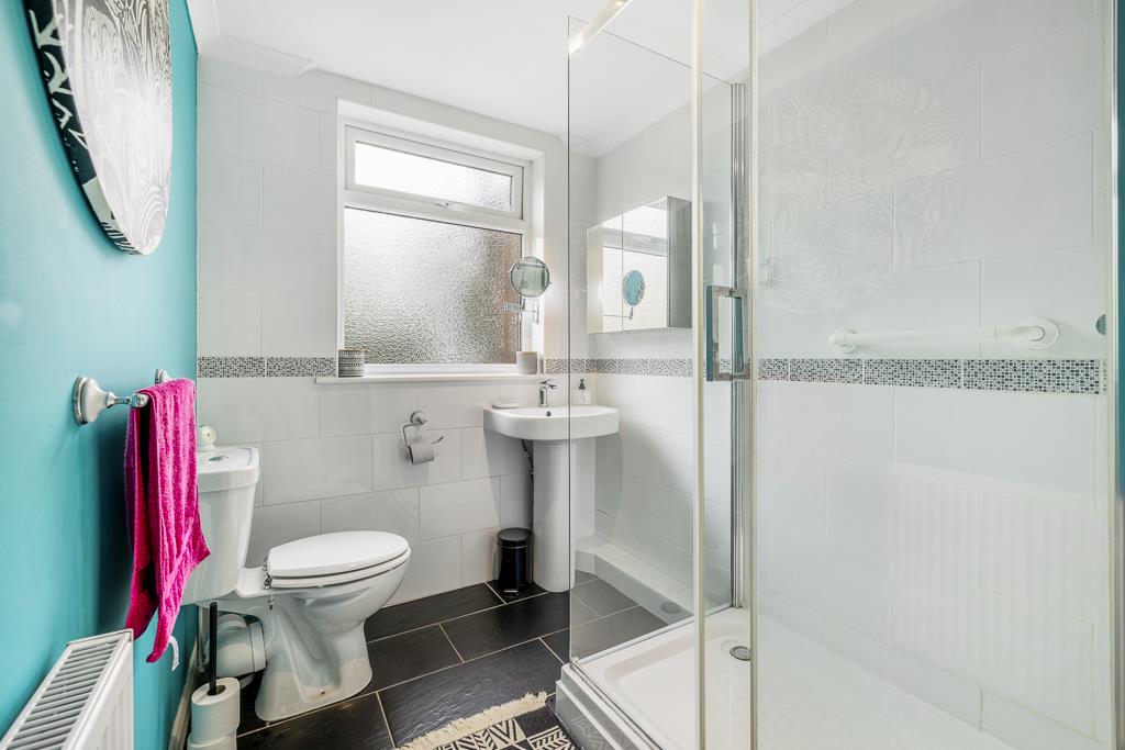UPVC window to rear. Shower cubicle. Wash hand basin. Toilet. Built in storage cupboard housing hot water cylinder. Radiator. Partially tiled walls. Tiled flooring.