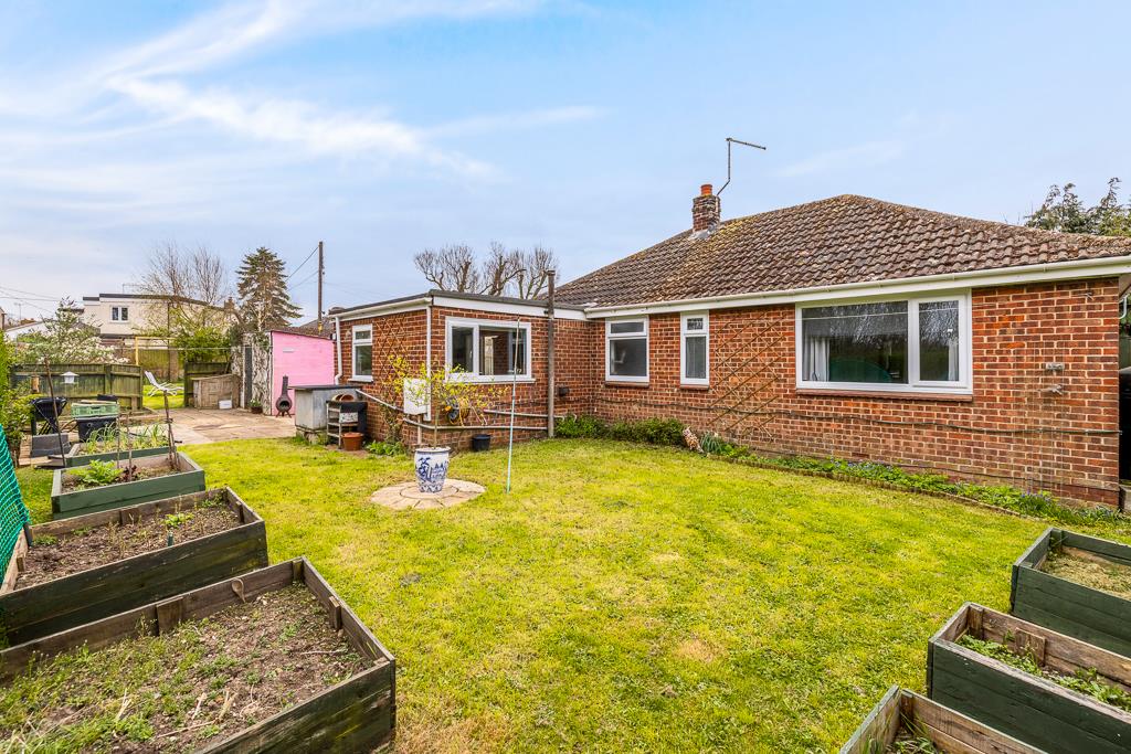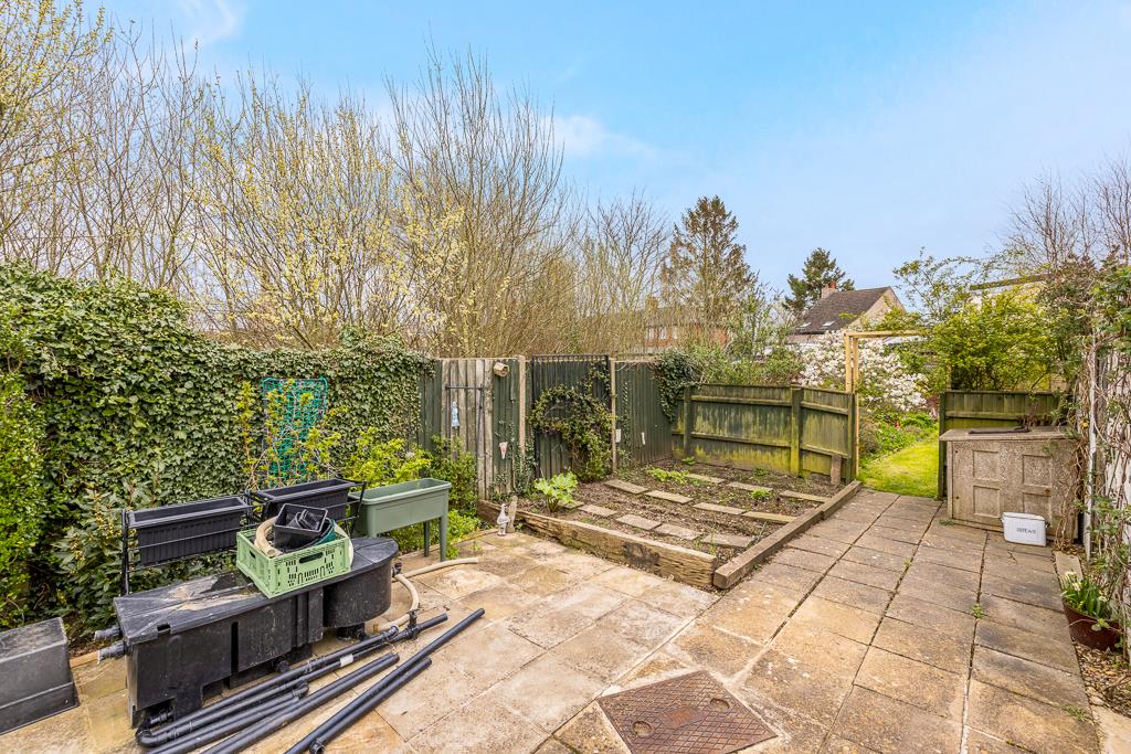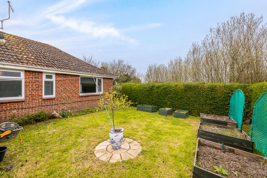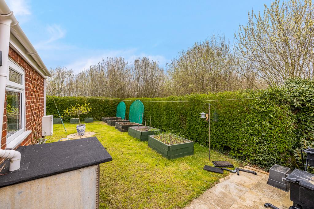 The rear garden is enclosed by timber fencing and hedging. Lawn area with shrub and hedge borders.