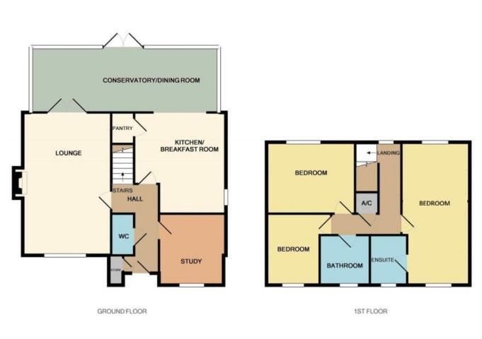 The ground floor comprises a welcoming entrance hall, convenient WC, and a versatile study/dining room, alongside a comfortable lounge, well-appointed kitchen, and a bright conservatory overlooking the garden.