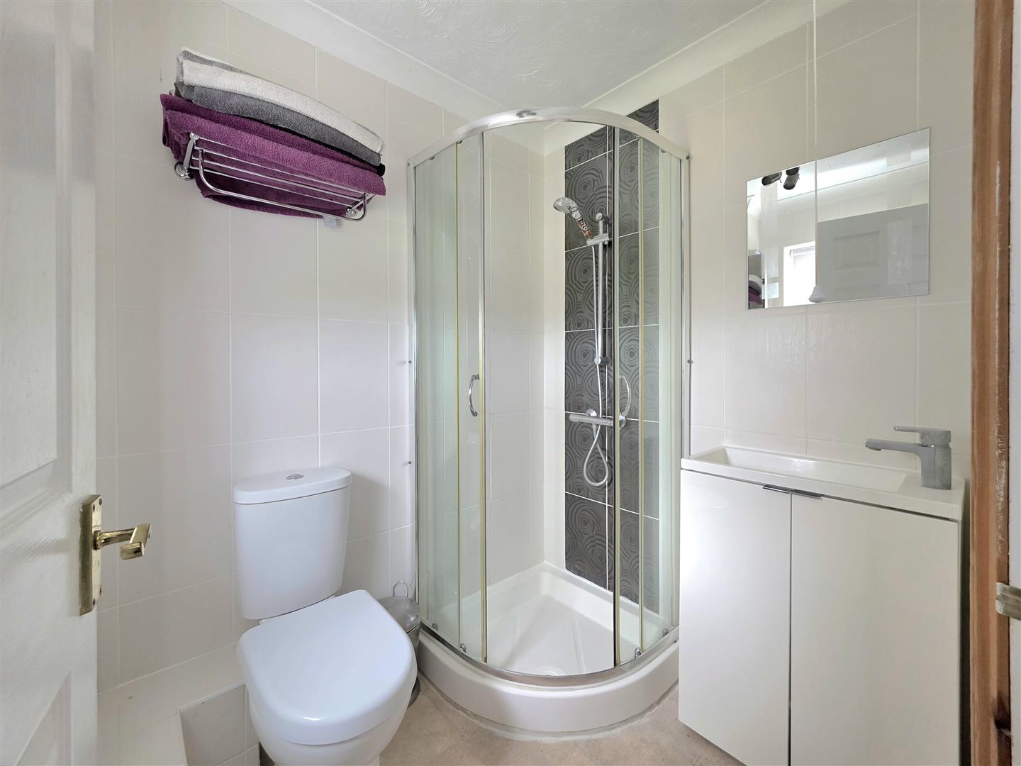 PVC double glazed window to front. Coving to ceiling. Vinyl flooring. Extractor fan. Shaver point. Chrome heated towel rail. Mirrored vanity cabinet. Fitted quadrant shower cubicle with chrome thermostatic bar shower over. Close coupled toilet with push button flush. Wash hand basin with chrome mixer tap and set in vanity unit with built in storage.