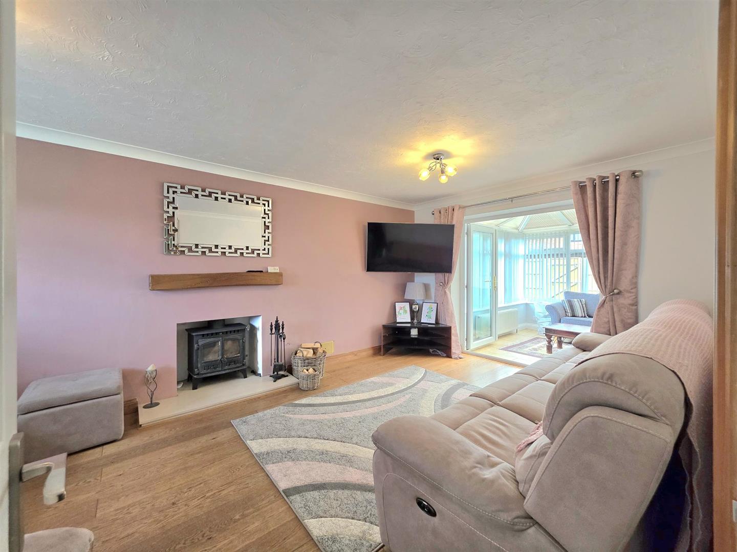 PVC double glazed window to front. Coving to ceiling. French doors leading to conservatory. Radiator. Inset cast iron wood burner with marble hearth. Wood flooring.