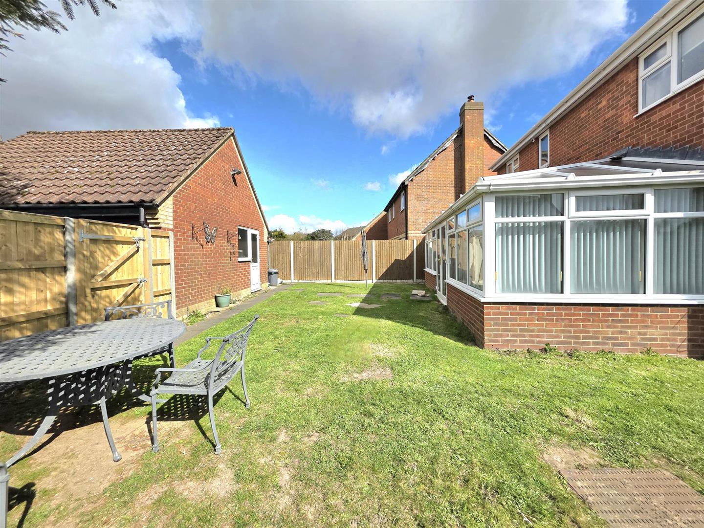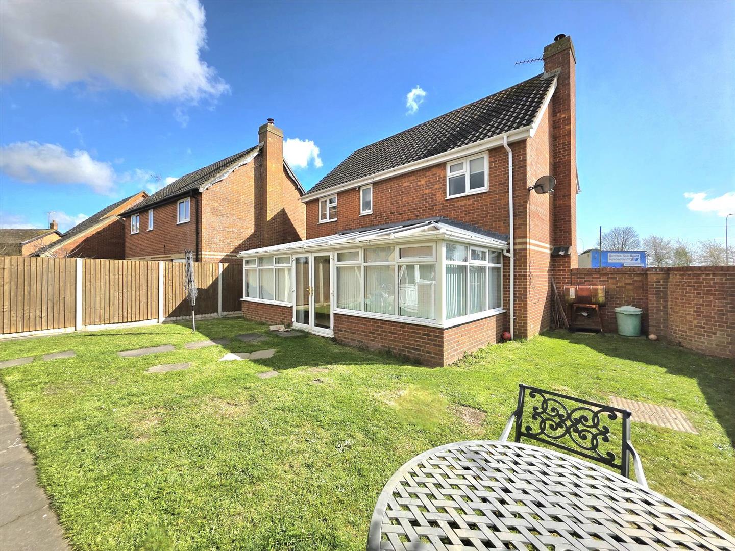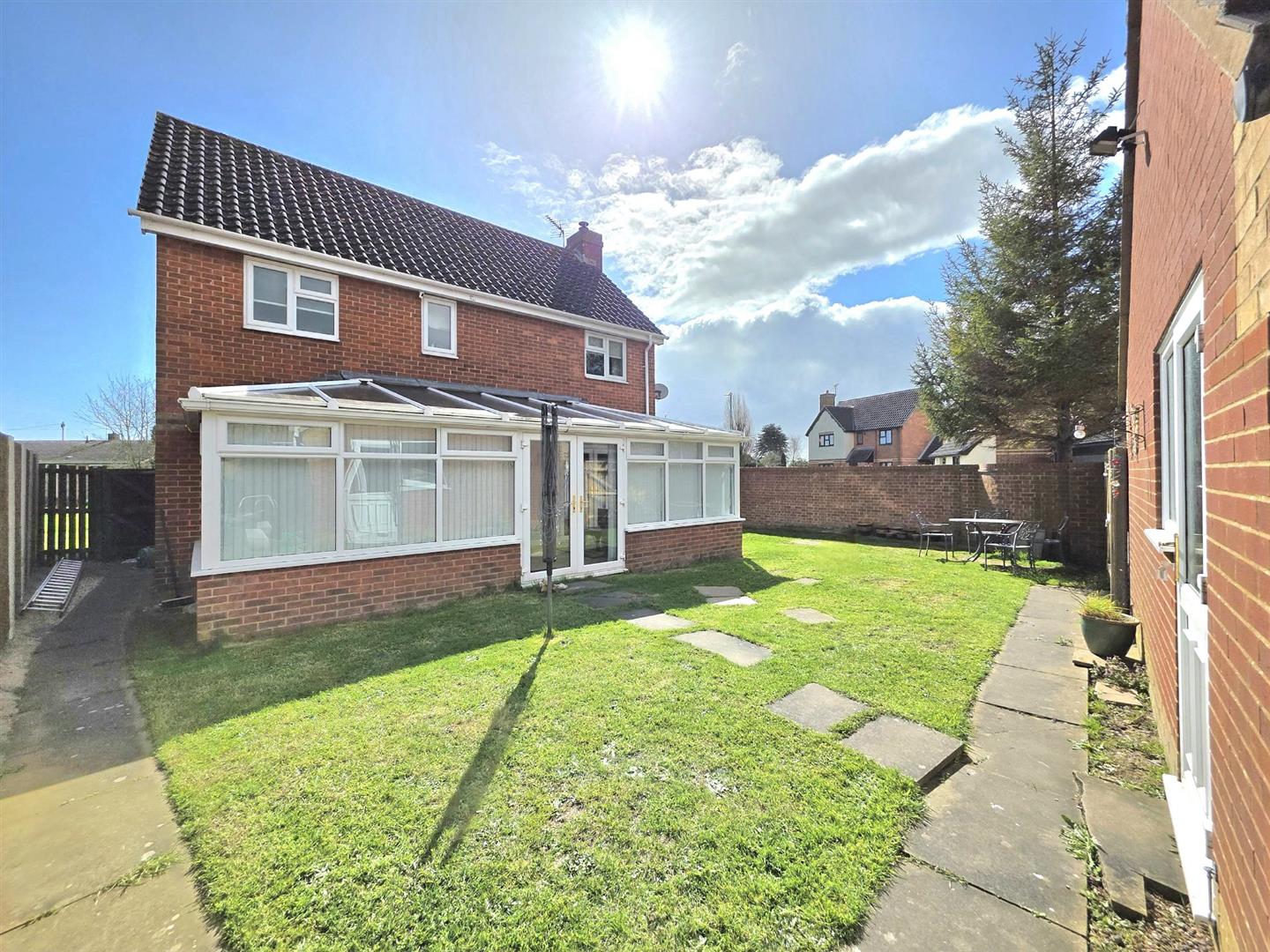 The rear garden is enclosed by brick walling and timber fencing. Laid to lawn. Patio area. Timber shed. Covered area ideal for garden storage. Door leading to garage.
