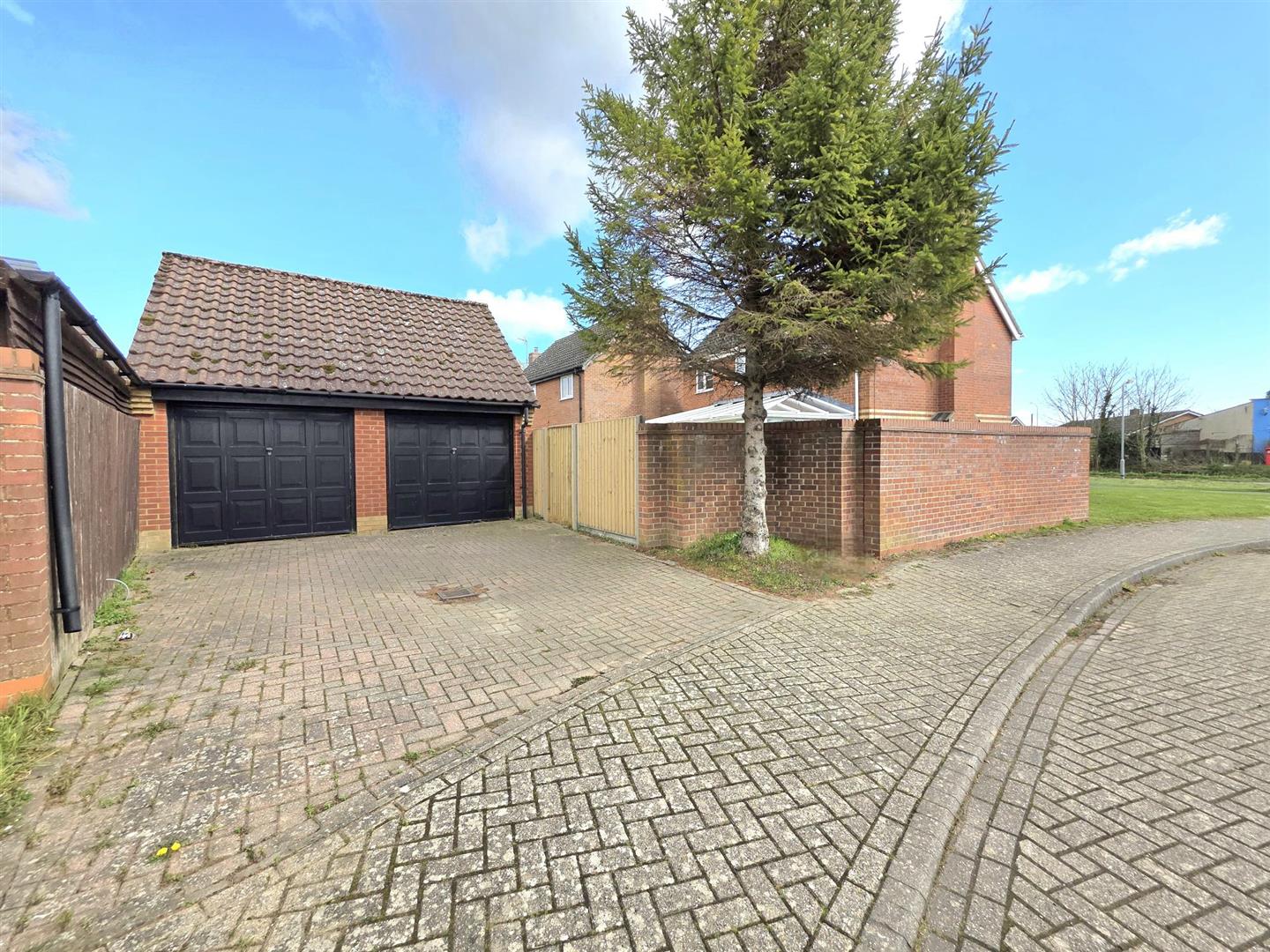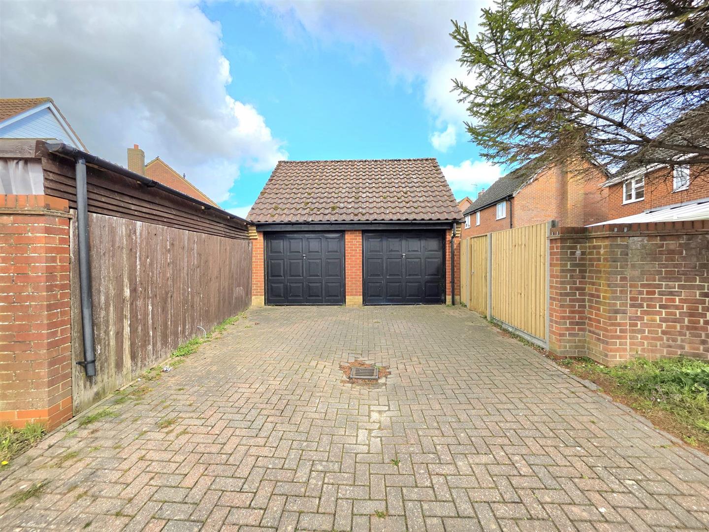 Block paved driveway leading to twin up and over vehicular doors to front. Power and light connected. PVC double glazed window to side. Eaves storage with access ladder.