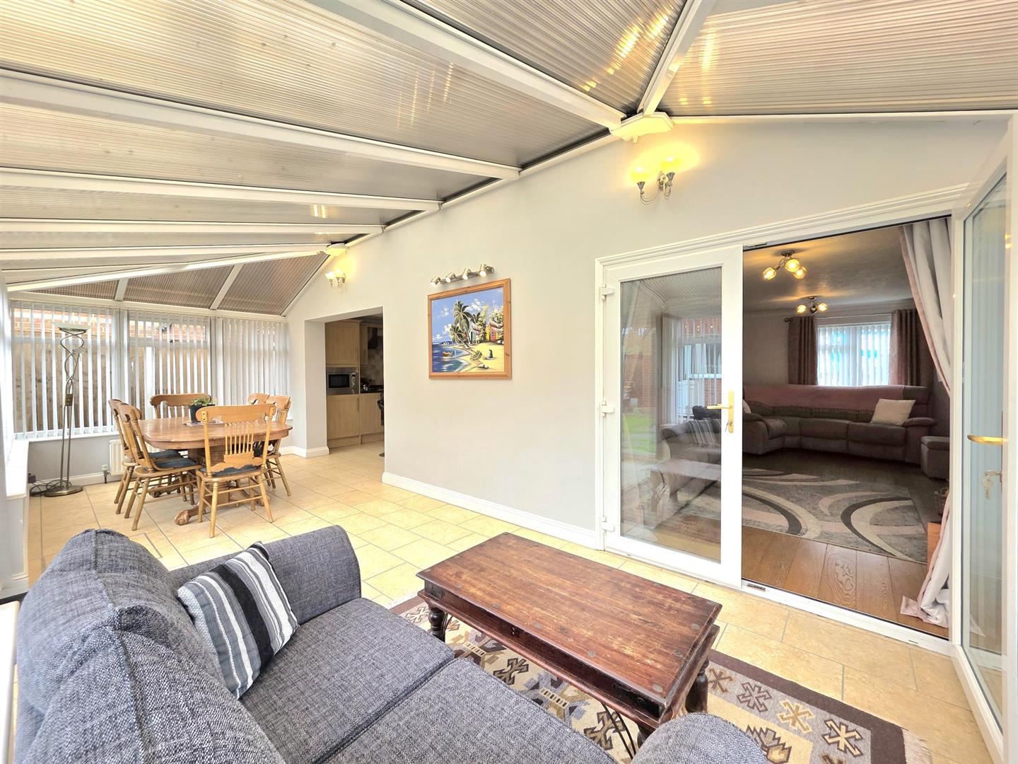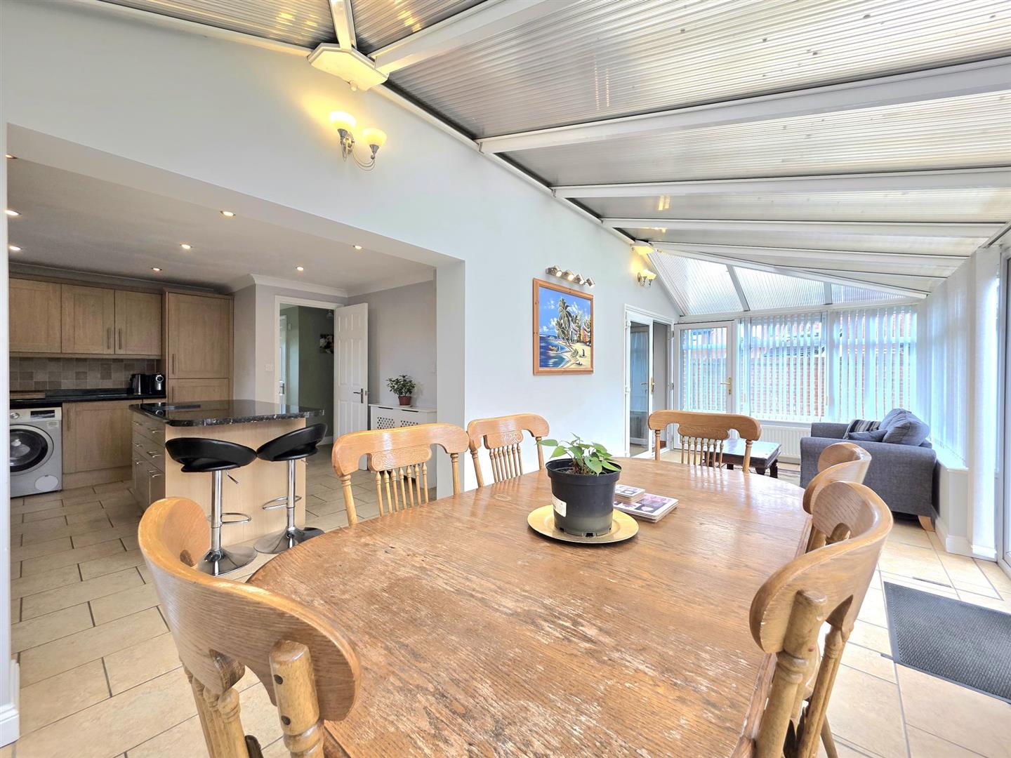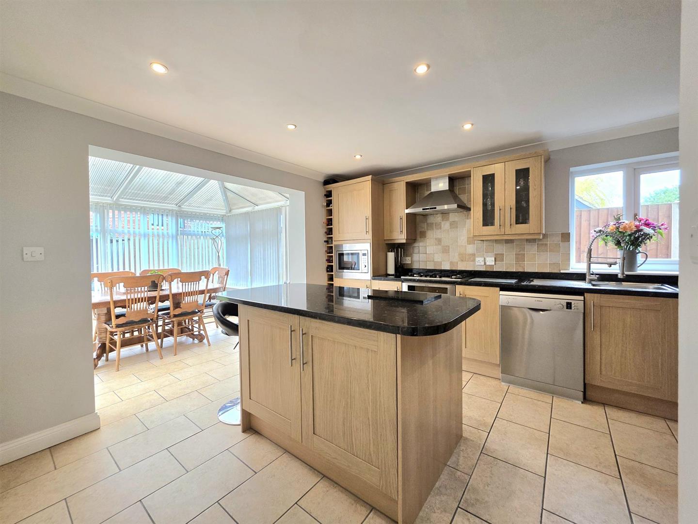 PVC window to side. Coving to skimmed ceiling with recessed spot lights. Opening to conservatory. Built in under stairs storage cupboard. Radiator. Tiled flooring. Fitted with a matching range of base and eye level units with roll edge work surfaces and matching upstands. Tiled splash backs. Sink unit with drainer and mixer tap. 5 ring gas hob with stainless steel extractor hood over. Built in electric oven and grill. Integrated microwave. Space and plumbing for dishwasher. Space and plumbing for washing machine. Full height fridge.