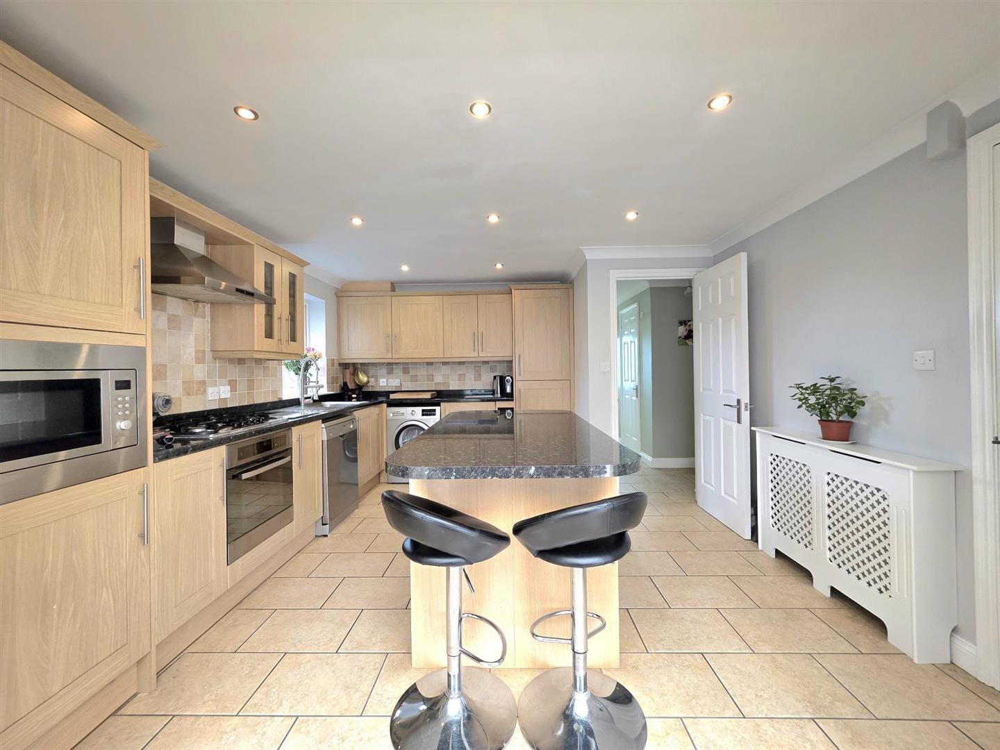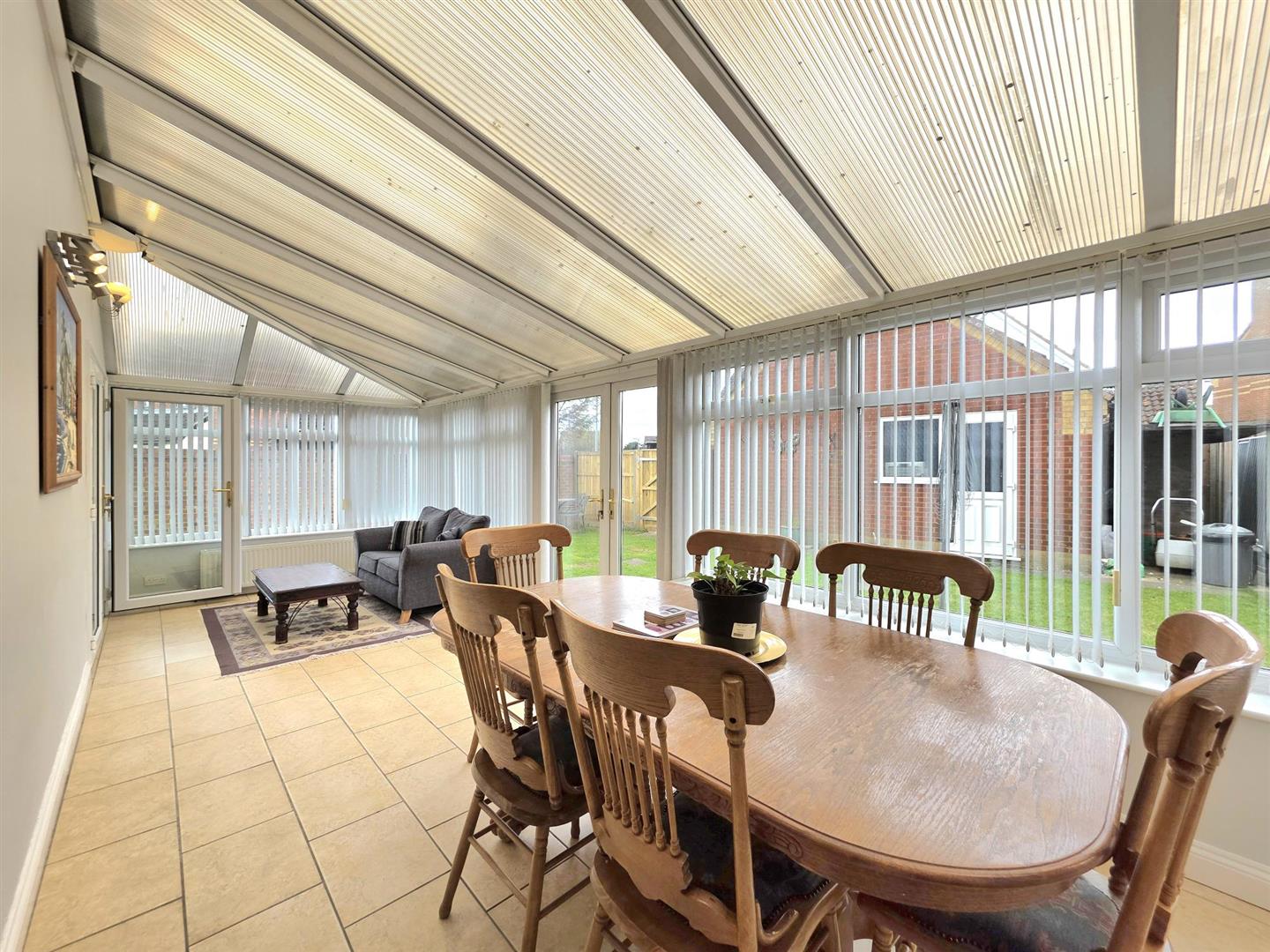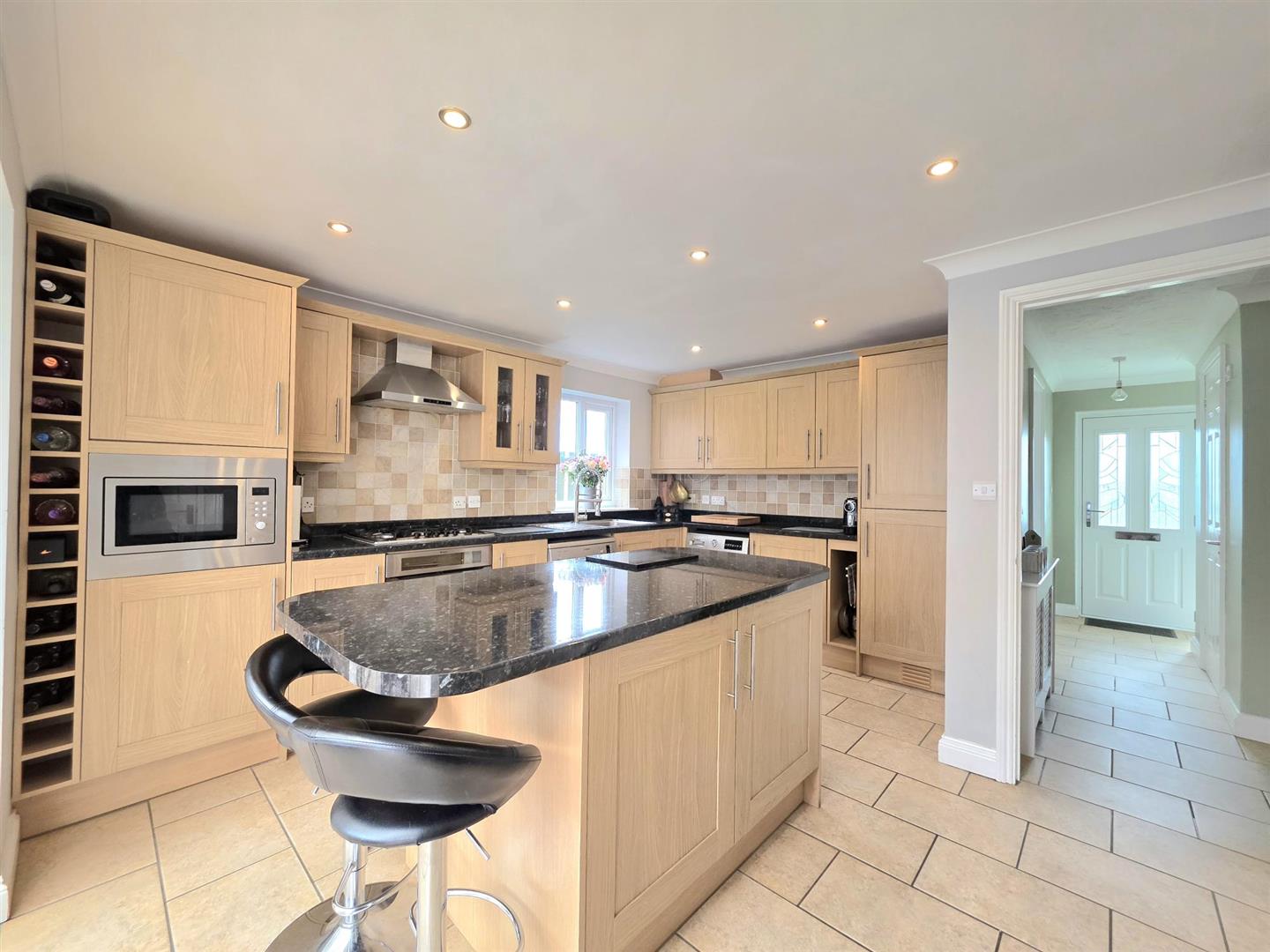 PVC window to side. Coving to skimmed ceiling with recessed spot lights. Opening to conservatory. Built in under stairs storage cupboard. Radiator. Tiled flooring. Fitted with a matching range of base and eye level units with roll edge work surfaces and matching upstands. Tiled splash backs. Sink unit with drainer and mixer tap. 5 ring gas hob with stainless steel extractor hood over. Built in electric oven and grill. Integrated microwave. Space and plumbing for dishwasher. Space and plumbing for washing machine. Full height fridge.