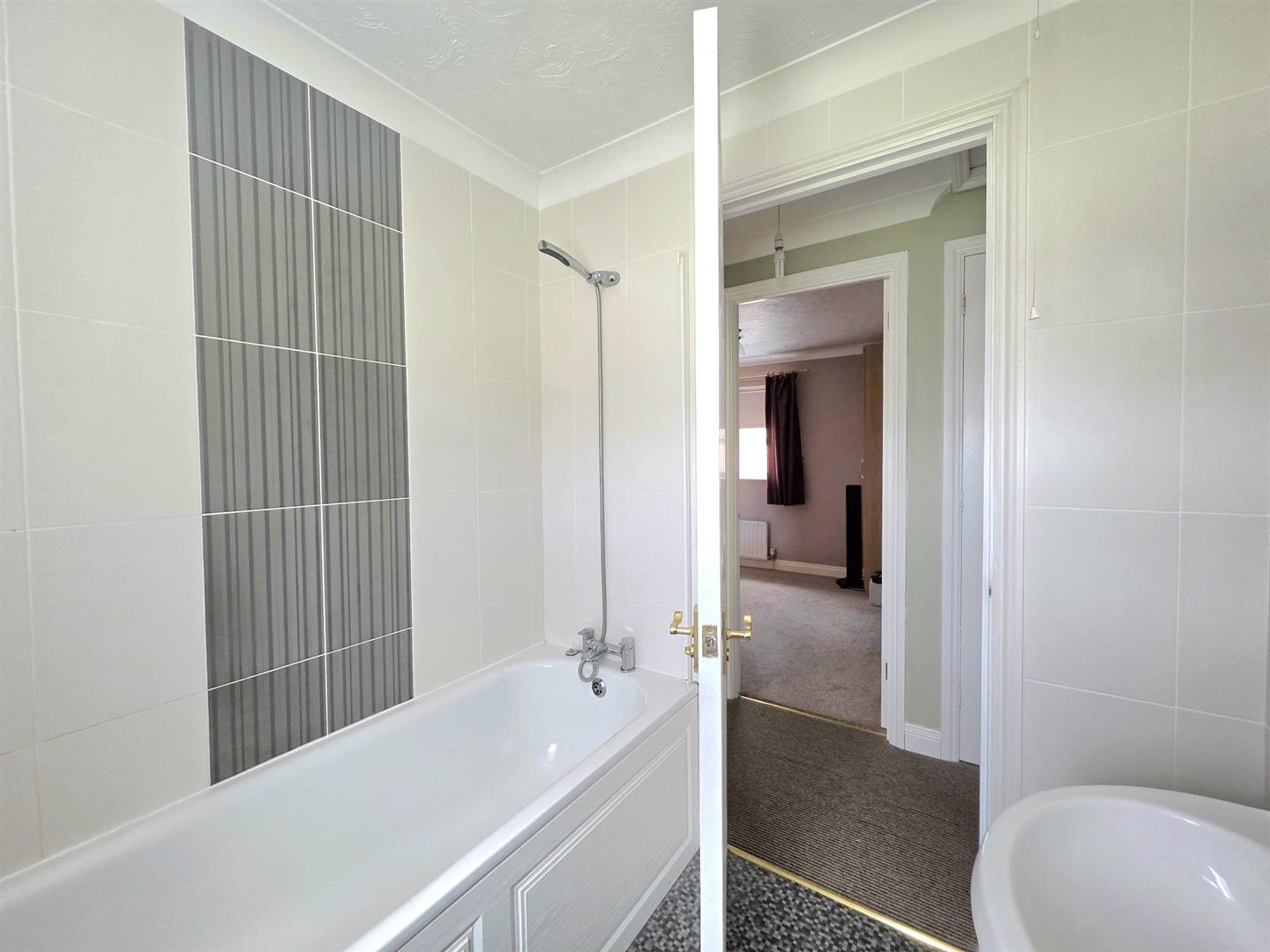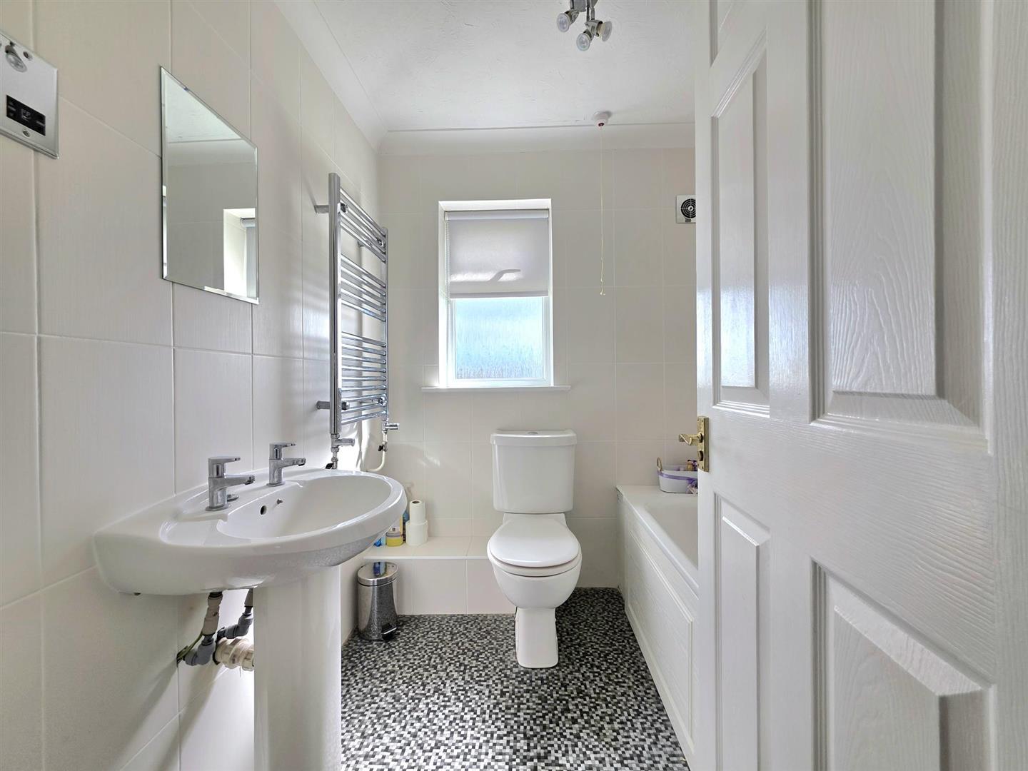 PVC double glazed window to front. Coving to ceiling. Vinyl flooring. Extractor fan. Shaver point. Chrome heated towel radiator. Fitted panelled bath chrome mixer tap and shower attachment. Close coupled toilet with push button flush. Pedestal wash hand basin with chrome taps over.