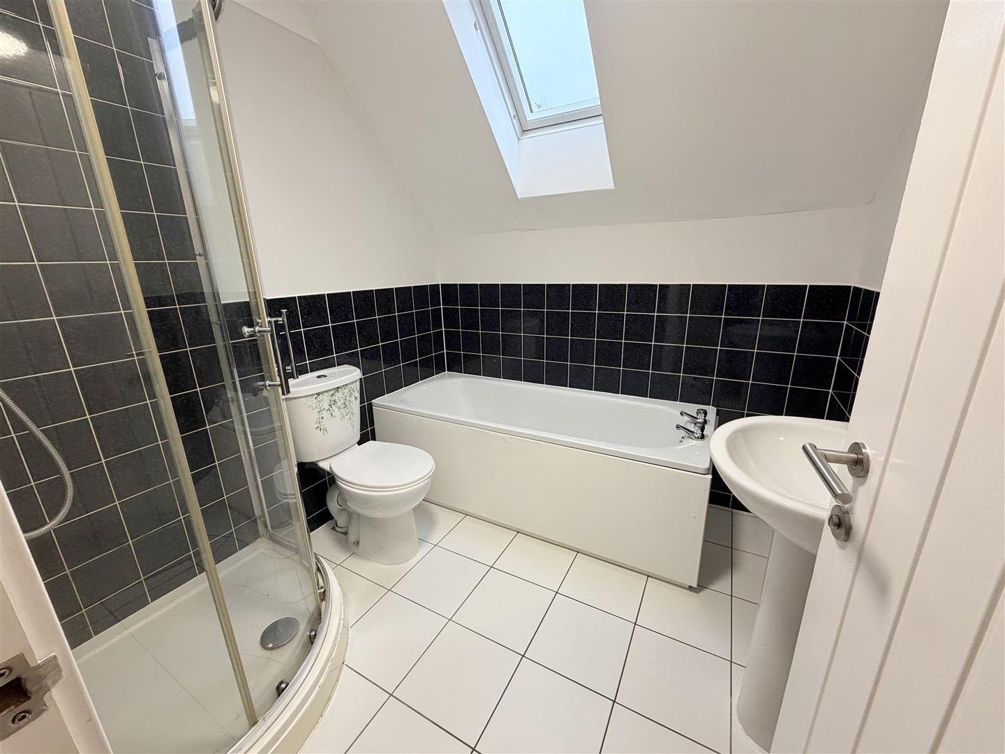 Modern bathroom with a vaulted skylight to the rear aspect. Comprising a bath, separate shower, hand basin, and toilet, with tiled flooring throughout.