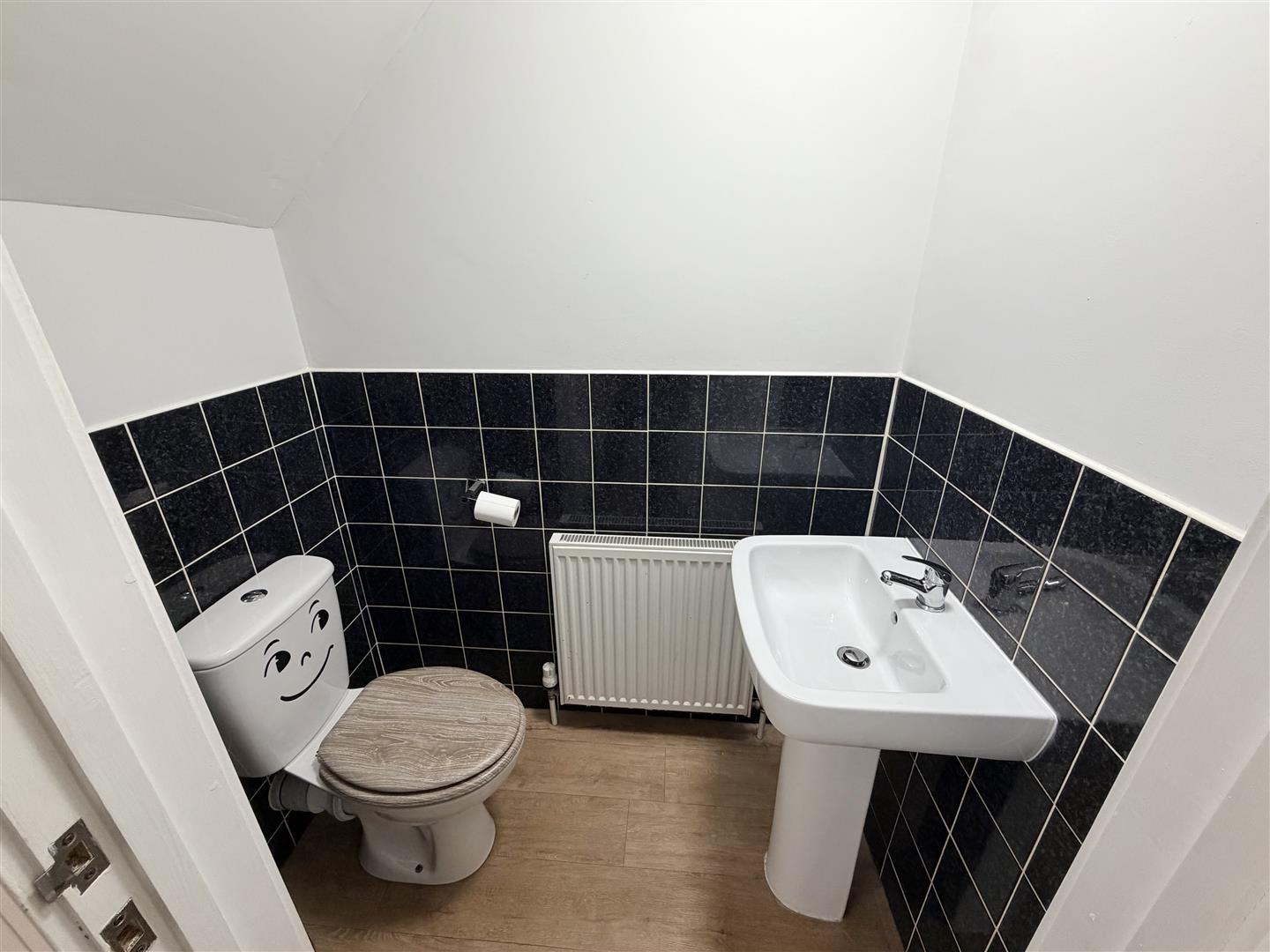Convenient separate WC fitted with toilet and hand basin, laminate flooring, and radiator.