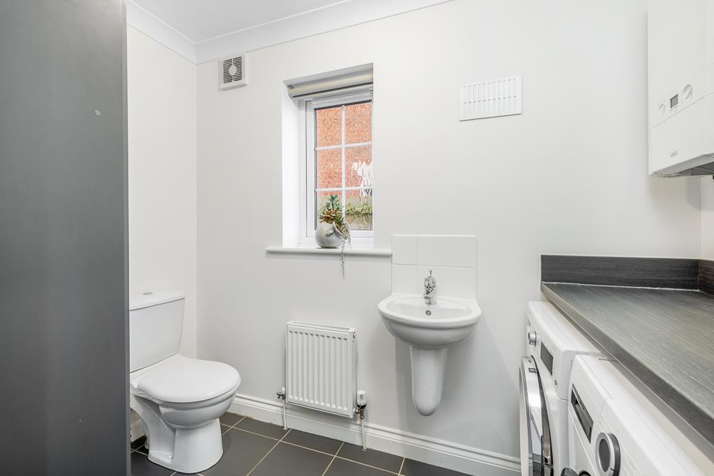 Double glazed window to side. Plumbing for washing machine. Wall mounted boiler. Toilet. Wash hand basin. Tiled flooring. Radiator.