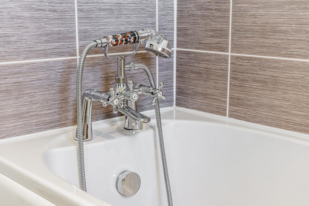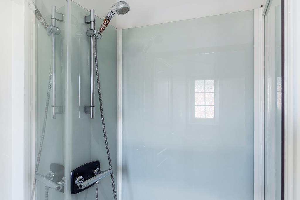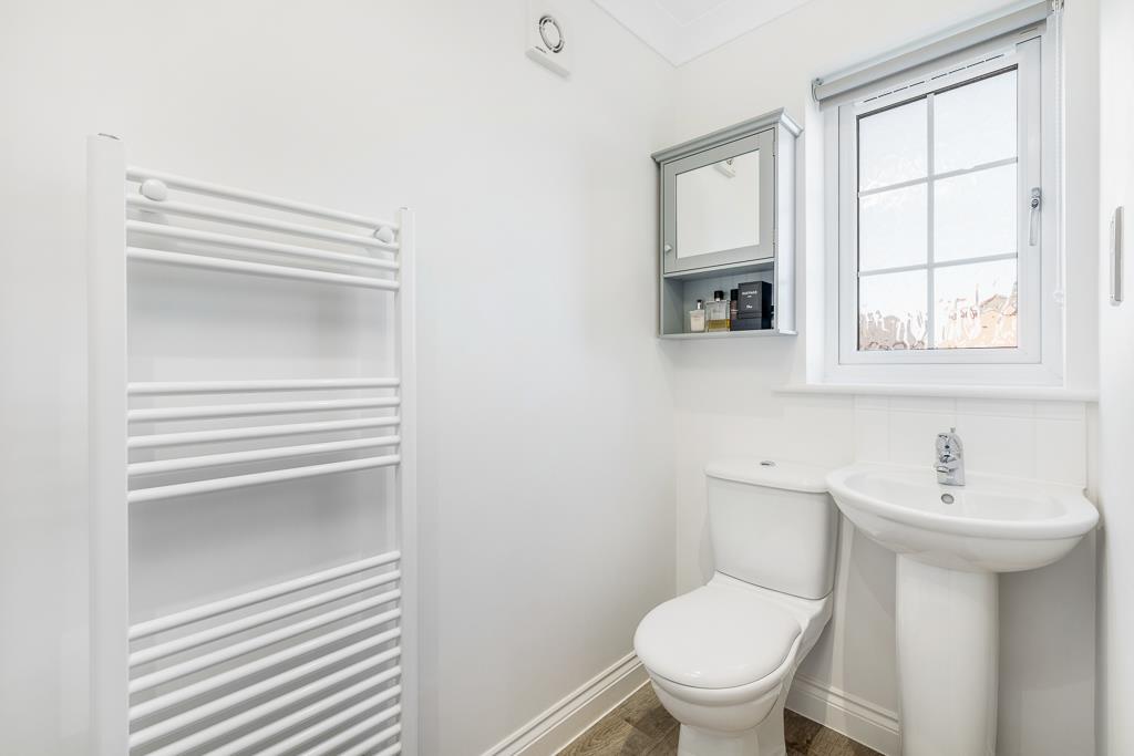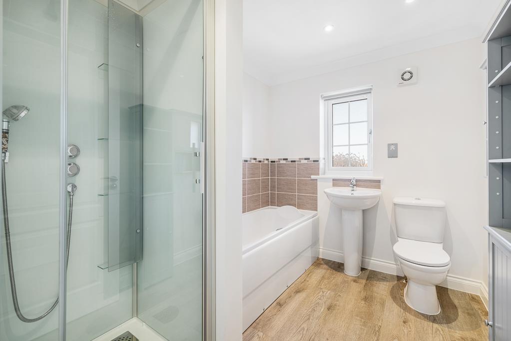 Double glazed window to rear. Four piece suite consisting of a shower cubicle. Bath. Toilet. Pedestal wash hand basin. Shaver point. Heated towel rail. Wood effect flooring.