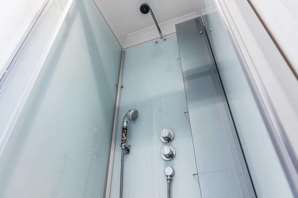 Double glazed window to rear. Shower cubicle. Toilet. Wash hand basin. Heated towel rail. Shaver point. Wood effect flooring.