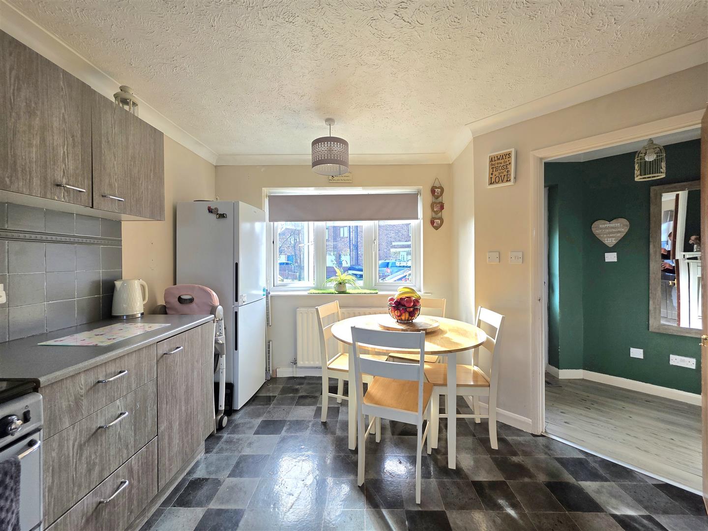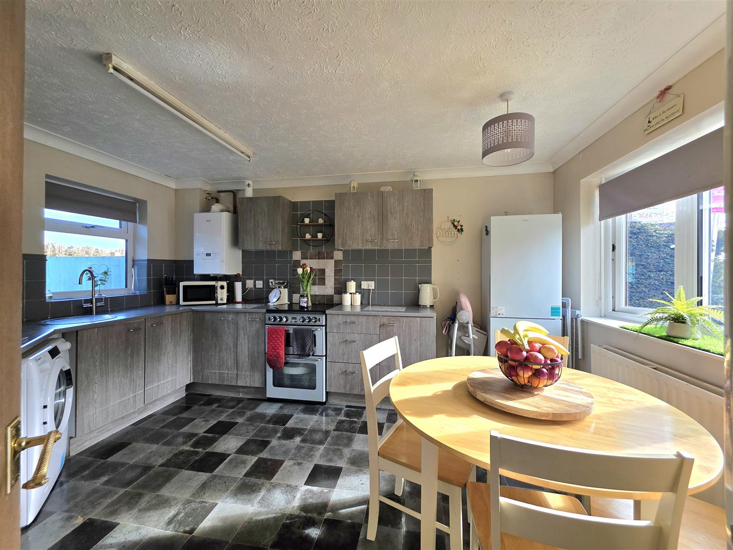 PVC double glazed windows to front and rear. Coving to ceiling. Vinyl flooring. Wall mounted mains gas central heating boiler. Fitted with a matching range of base and eye level units with roll edge work surfaces and tiled splash backs. Free standing gas cooker. Stainless steel sink with chrome mixer tap. Space for fridge/freezer. Space and plumbing for washing machine and tumble dryer.