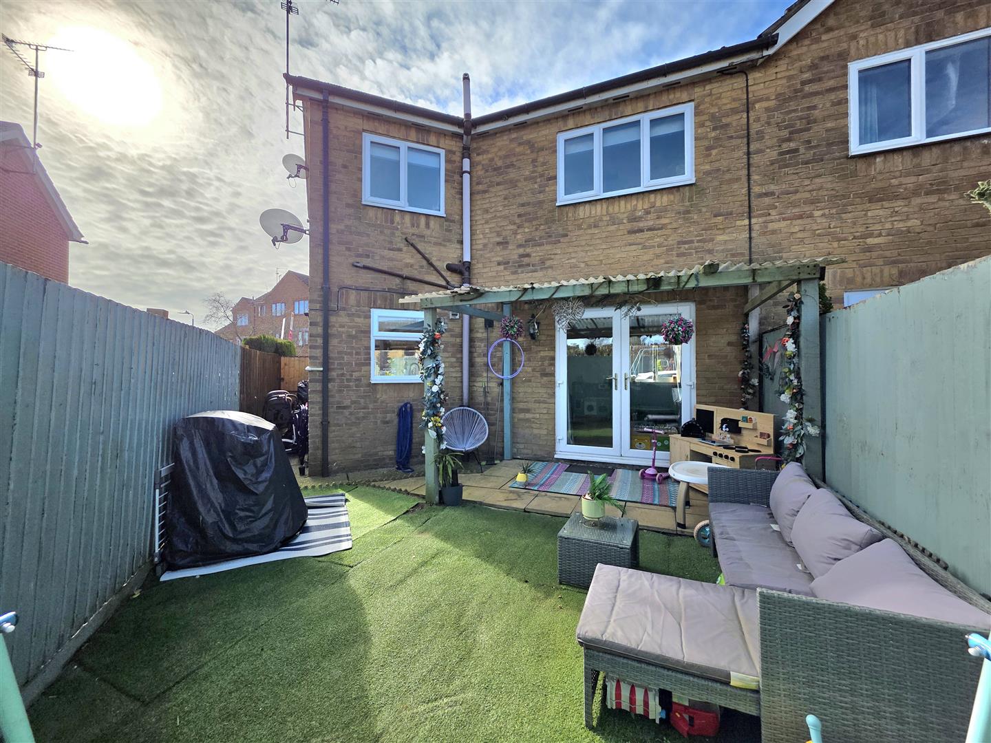 The rear garden is enclosed by timber fencing. Artificial lawn area. Patio seating area. Pergola with perspex roof.