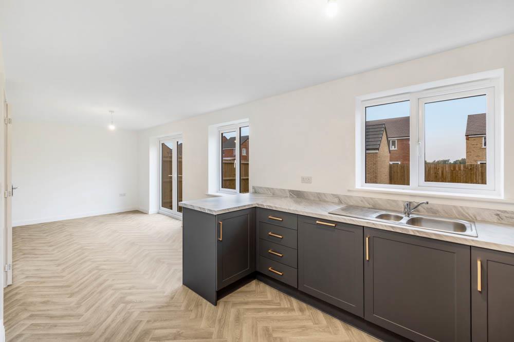 Two UPVC windows to rear. French doors to rear. Matching base and eye level unit with matching work surfaces over. Stainless steel sink drainer with mixer tap. Built in fridge/freezer. Built in dishwasher. Built in four ring gas hob with extractor over. Built in oven. LVT flooring. Two radiators.