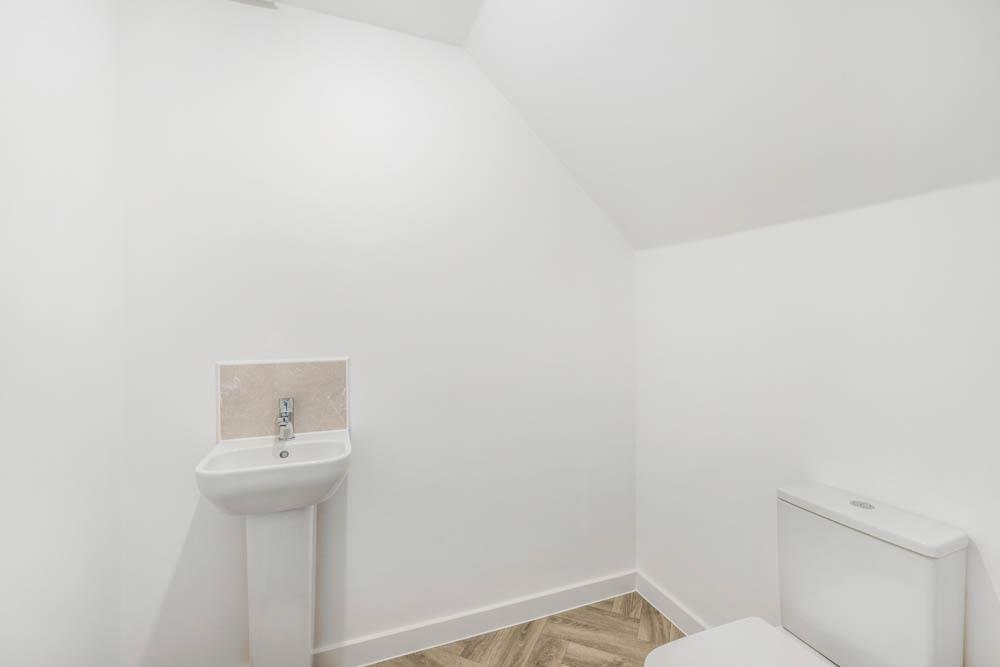 Toilet. Wash hand basin with tiled splash back. Radiator. LVT flooring. Extractor fan.