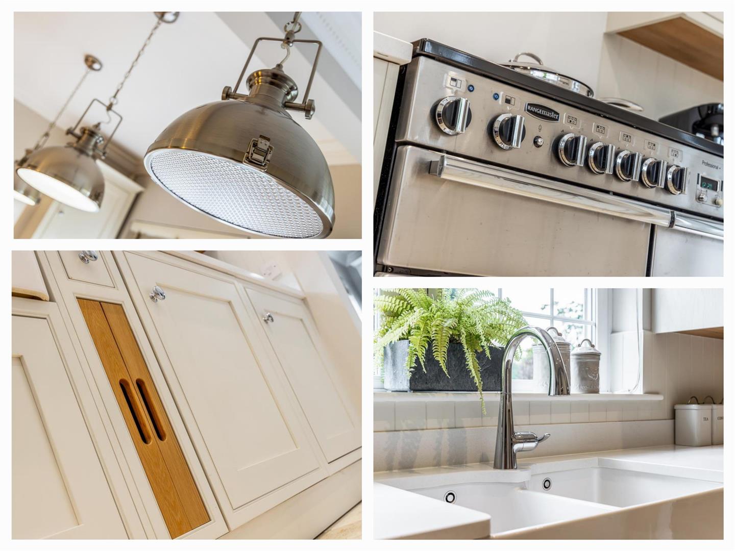 UPVC sash window to rear. French doors to rear. American style fridge/freezer with built in surrounding cupboards. Radiator. Tiled flooring. Matching inset shaker style base and eye level units with quartz work surface over. Tiled splash backs. Belfast double sink with adjustable mixer tap over. Built in Neff dishwasher. Rangemaster cooker with induction hob and extractor hood over.