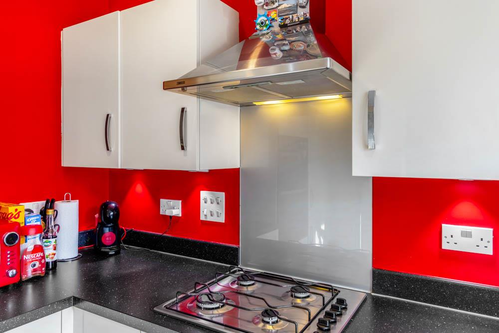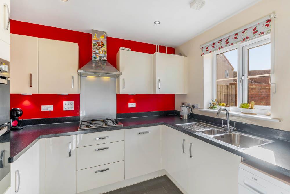 UPVC double glazed window to front. Matching base and eye level units with a work surface over. Sink inset with drainer with mixer taps over. Integrated electric oven and grill. Four burner Zanussi gas hob and Zanussi extractor over. Cupboard housing wall mounted gas fired boiler. Integrated fridge. Integrated freezer. Integrated dishwasher. Space for free standing washing machine.