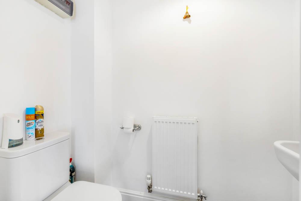 Toilet. Pedestal wash hand basin with mixer tap over and tiled splash back. Radiator. Extractor fan.