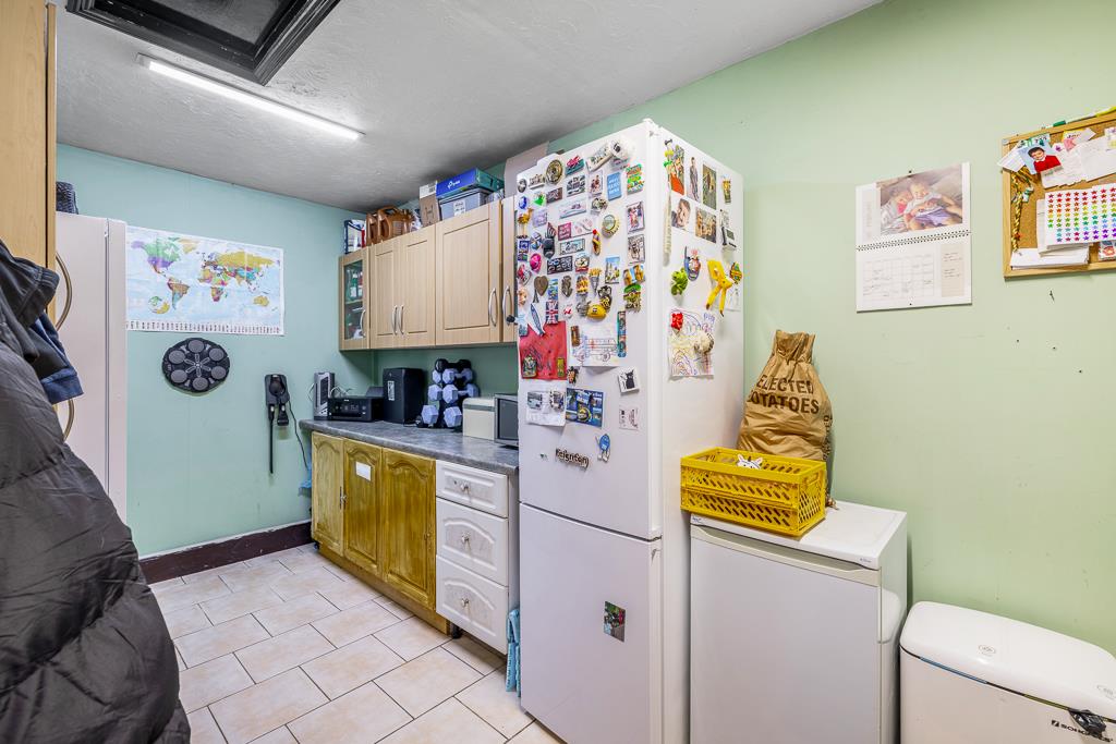 UPVC window to rear. Matching base and eye level units with work surfaces over. Sink unit with drainer and mixer tap. Tiled splash backs. Space for cooker. Extractor hood. Space for fridge freezer. Space and plumbing for dishwasher. Tiled flooring. Radiator.