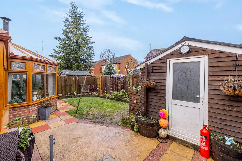 The rear garden is enclosed by timber fencing. Lawn area. Extended patio area. Raised borders with shrubs. Timber shed.