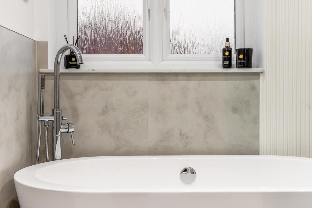 PVC double glazed window to rear. Skimmed ceiling. Spot lighting. Extractor fan. Shaver point. Chrome wall mounted heated towel rail. Tiled flooring. Free standing bath with chrome wall mounted bath spout and shower attachment. Wash hand basin set in vanity unit with built in storage. Fitted storage cupboard.