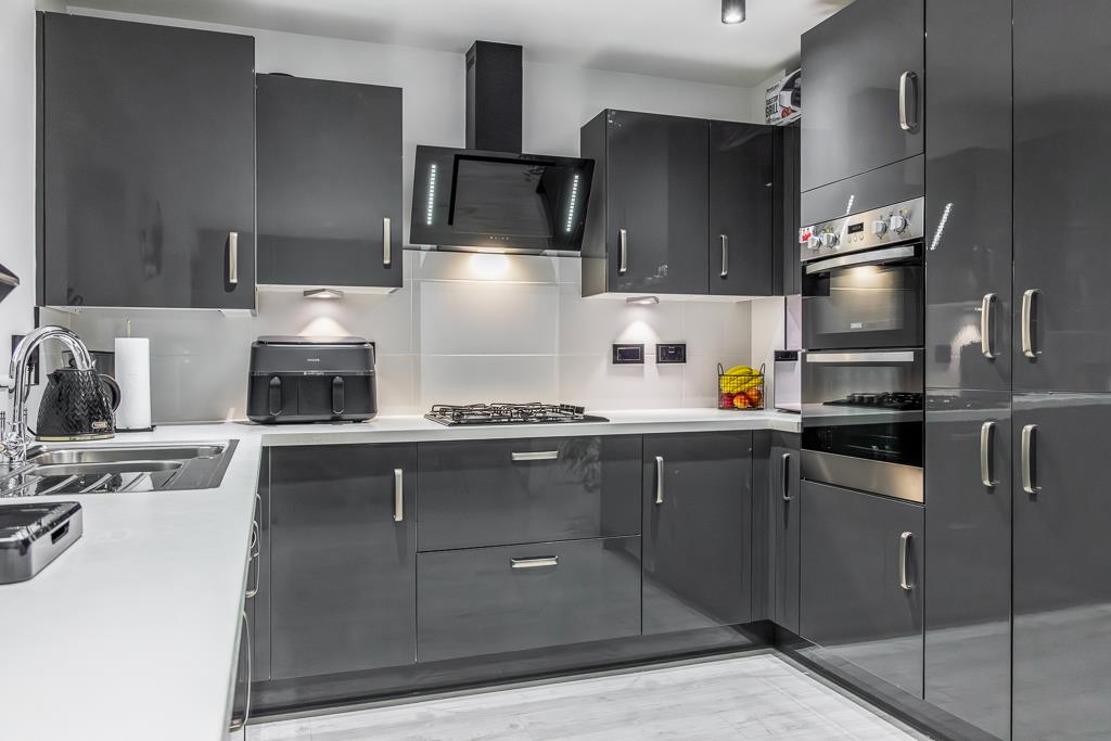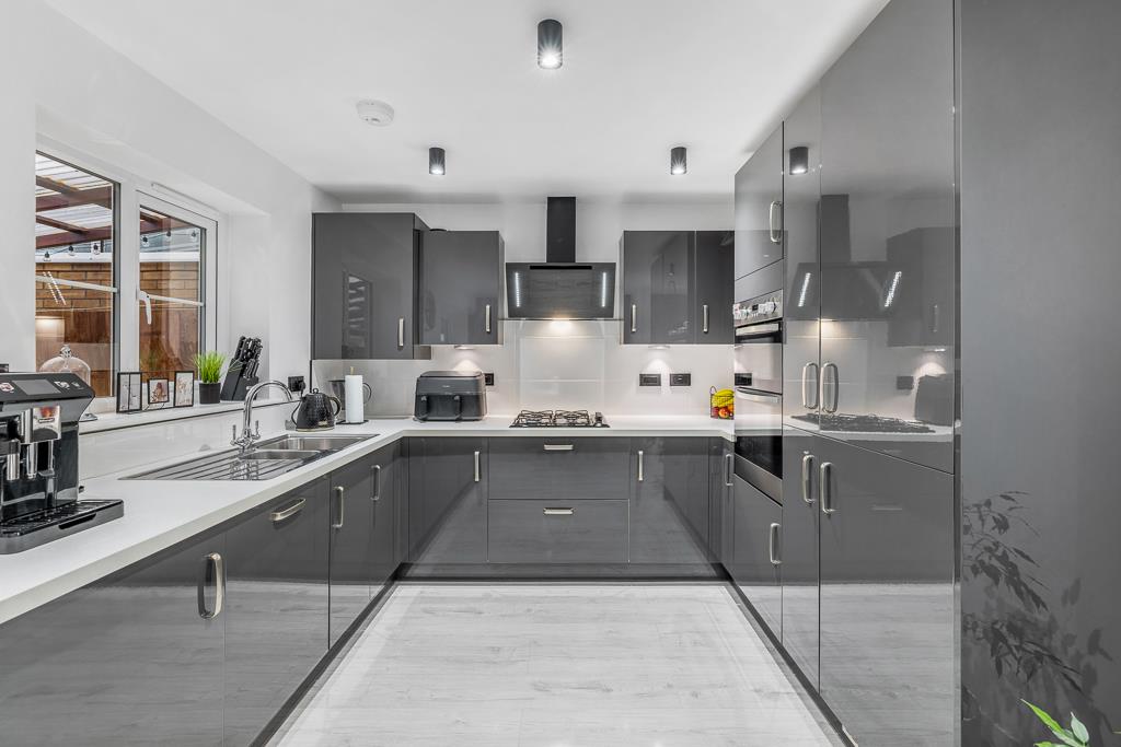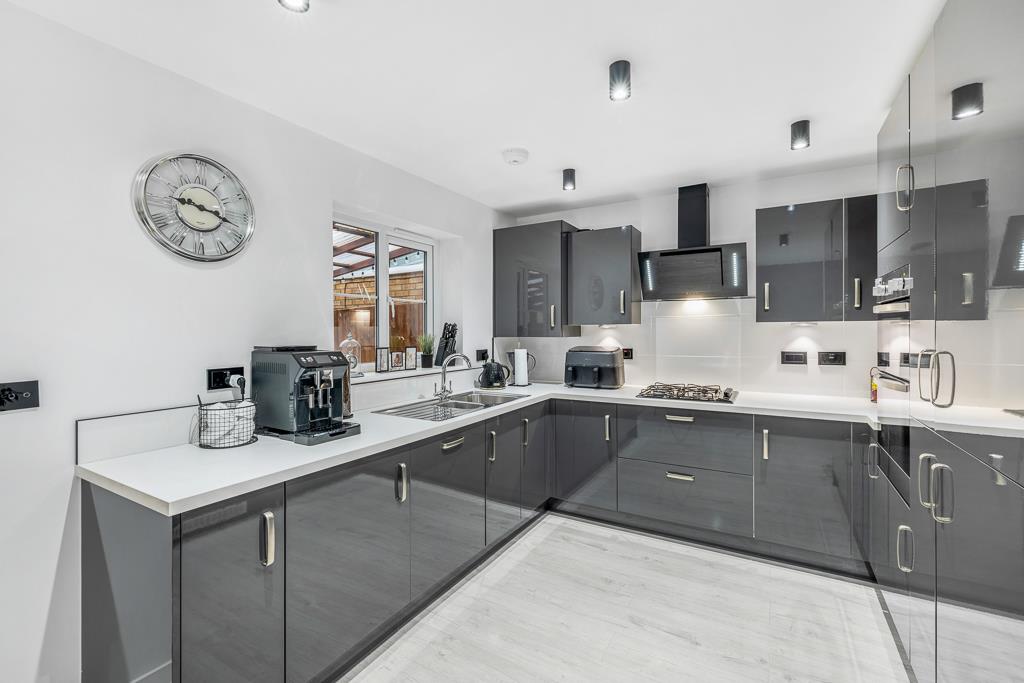 PVC double glazed window and French doors to rear. Skimmed ceiling. Matching range of base and eye level units with work surfaces over. Stainless steel sink unit with drainer and mixer tap. Integrated fridge freezer. Integrated washing machine. Integrated dishwasher. Four ring gas hob with extractor hood over. Built in oven and grill. Radiator. Wall mounted mains gas central heating boiler. Built in storage cupboard.