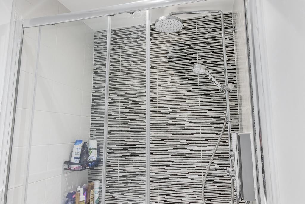 Skimmed ceiling. Recessed spot lighting. Extractor fan. Tiled flooring. Shaver point. Chrome heated towel rail. Fitted with a three piece suite comprising walk in shower enclosure with glass sliding door and electric shower, rainfall head and separate shower attachment. Close coupled toilet with push button flush. Wall mounted wash hand basin with chrome mixer tap.
