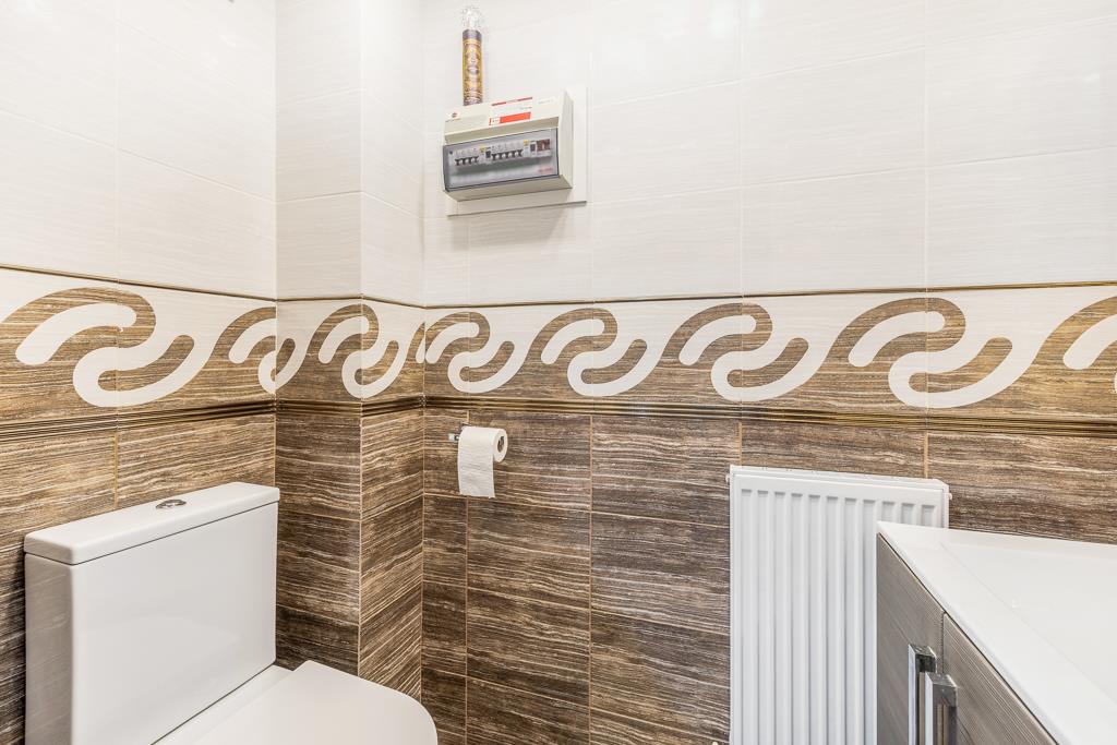 Skimmed ceiling. Tiled flooring. Full height wall tiling. Extractor fan. Wall mounted electric consumer unit. Radiator. Fitted close coupled toilet with push button flush. Ceramic wash hand basin set in vanity unit with chrome mixer tap.
