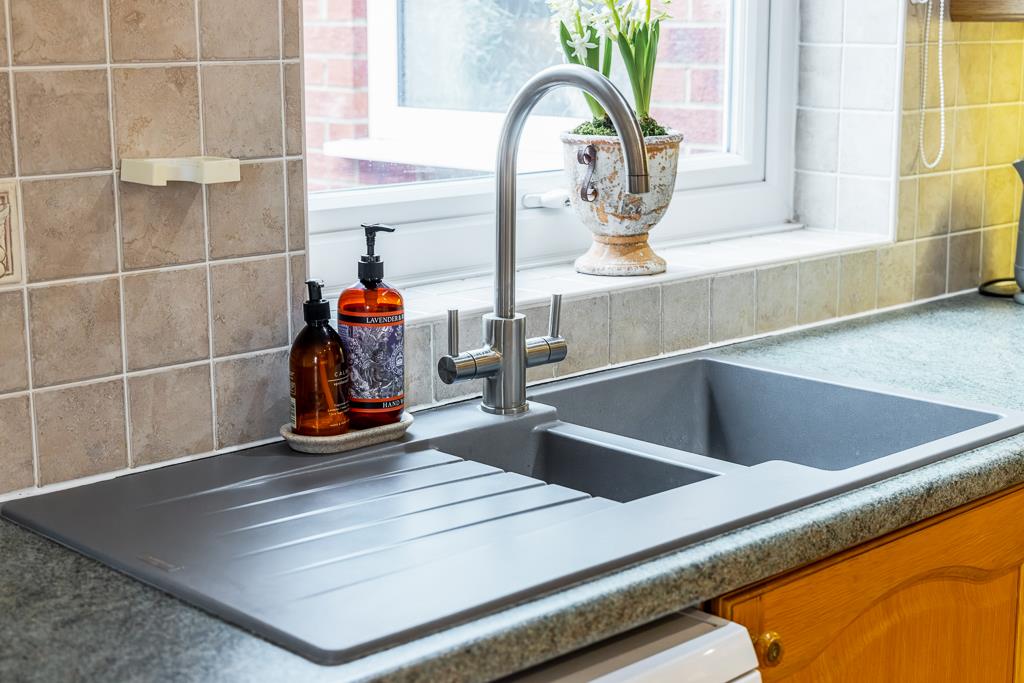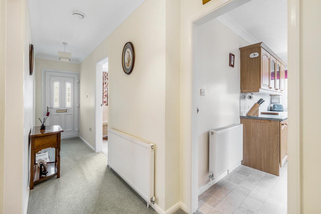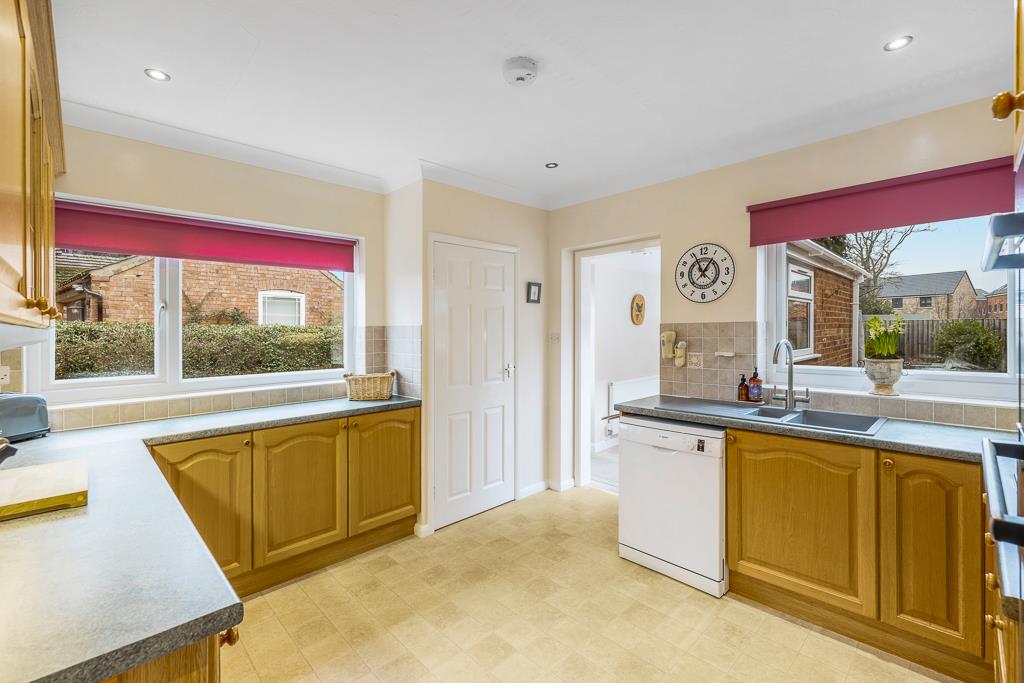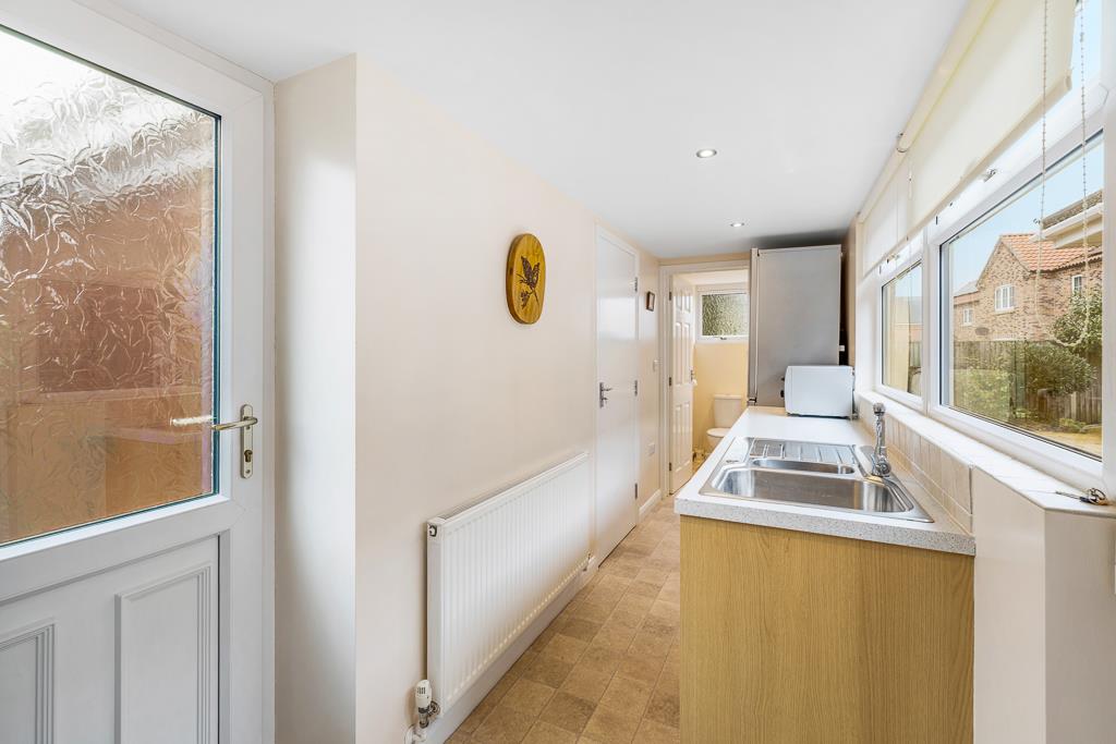 UPVC window to to side. Two UPVC doors, one leading to garden, one leading to driveway. Door to garage. Base units with work surface over. Stainless steel sink with drainer and mixer tap. Space and plumbing for washing machine. Space for tumble dryer. Space for fridge/freezer. Radiator. Tiled effect vinyl flooring.