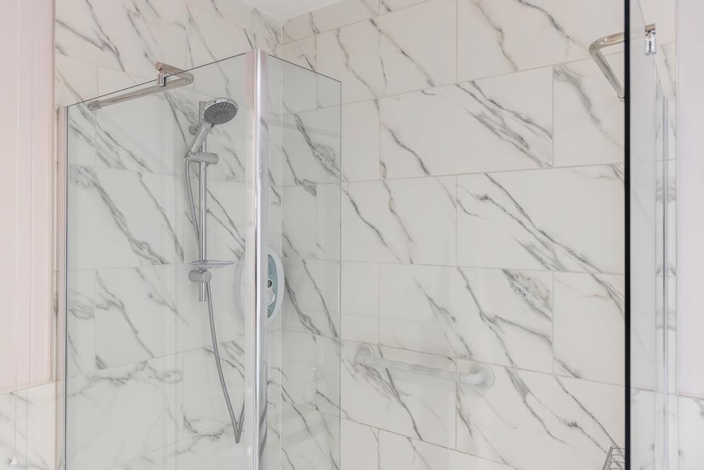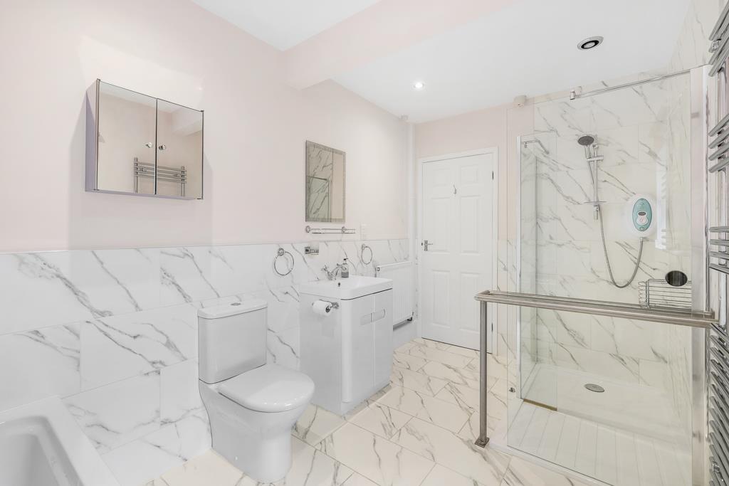 UPVC window to side. Panelled bath. Shower cubicle with shower over. Toilet. Wash hand basin set in vanity unit. Partially tiled walls. Wall mounted heated towel rail. Radiator. Shaver point. Extractor fan. Tiled flooring.