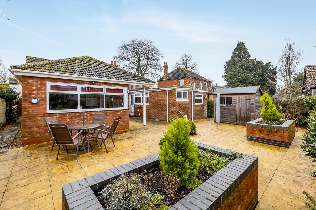 The rear garden is enclosed by timber fencing and hedging. Patio area with brick built raised planters.