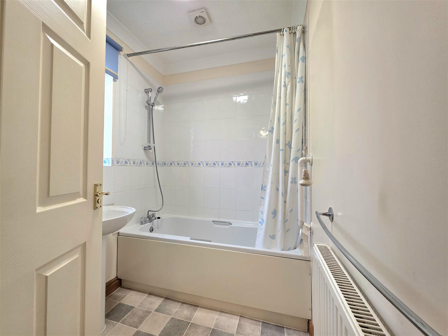 Double glazed window to rear. Coving to ceiling. Extractor fan. Vinyl flooring. Radiator. Mirrored vanity cabinet. Fitted panelled bath with chrome mixer tap and shower attachment. Pedestal wash hand basin with chrome tops. Close coupled toilet with push button flush.