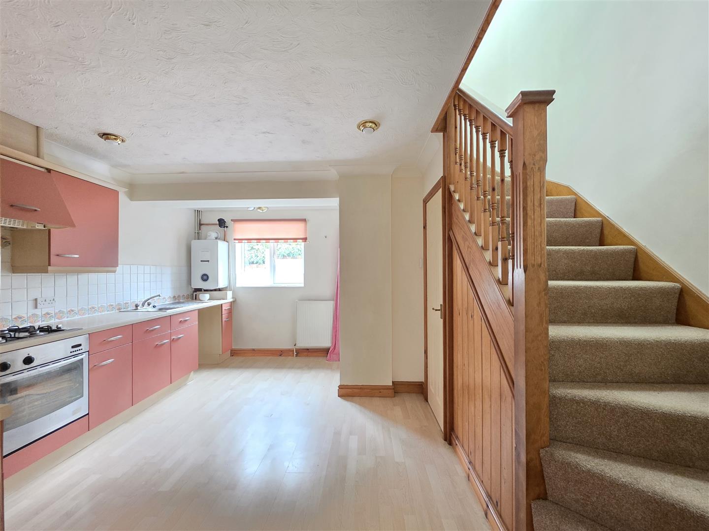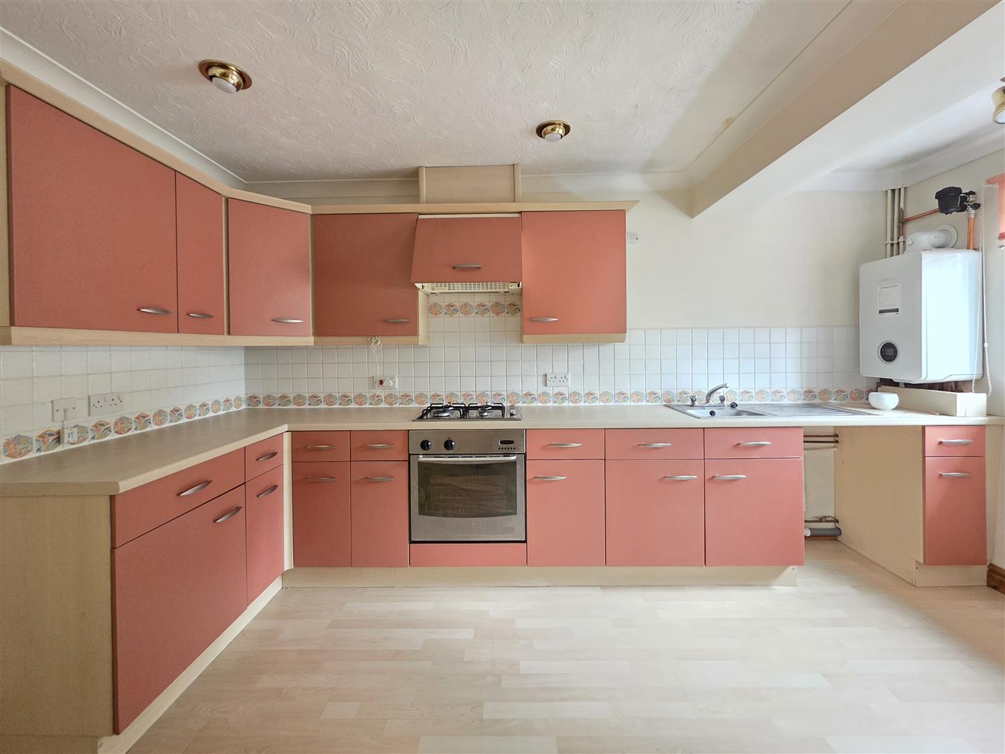 Double glazed entrance door to side. PVC double glazed window to rear. Coving to ceiling. Fitted with a matching range of wall and base units with roll edge work surface over. Tiled splash backs. Four ring gas hob with extractor hood over and electric oven and grill under. Stainless steel sink and drainer with chrome mixer tap. Space and plumbing for washing machine. Space for fridge freezer. Wall mounted mains gas Worcester central heating boiler. Stairs to first floor landing. Built in understairs storage cupboard with wall mounted electric consumer unit. Radiator. Laminate wood flooring.
