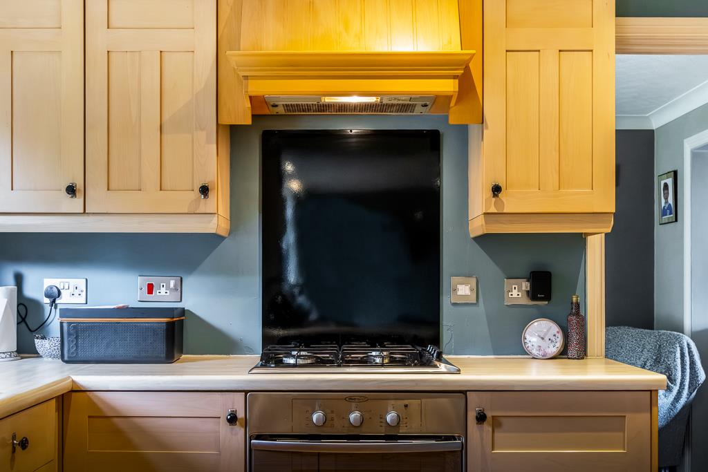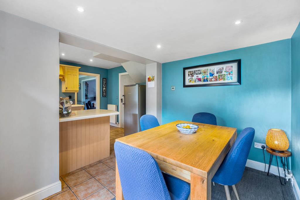 PVC double glazed windows to rear. Skimmed ceiling. Recessed spot lighting. Tiled flooring. Two radiators. Fitted with a matching range of base and eye level units with roll edged work surface. Four ring gas hob with extractor hood over and integrated electric oven and grill under. Integrated fridge. Space for fridge/freezer. Door to lounge/diner and utility room.