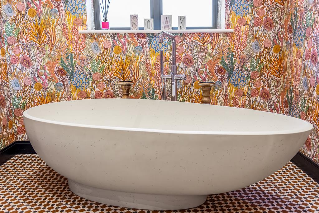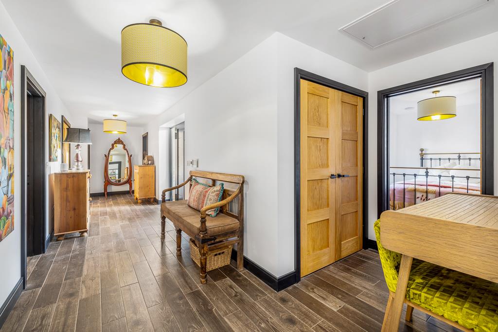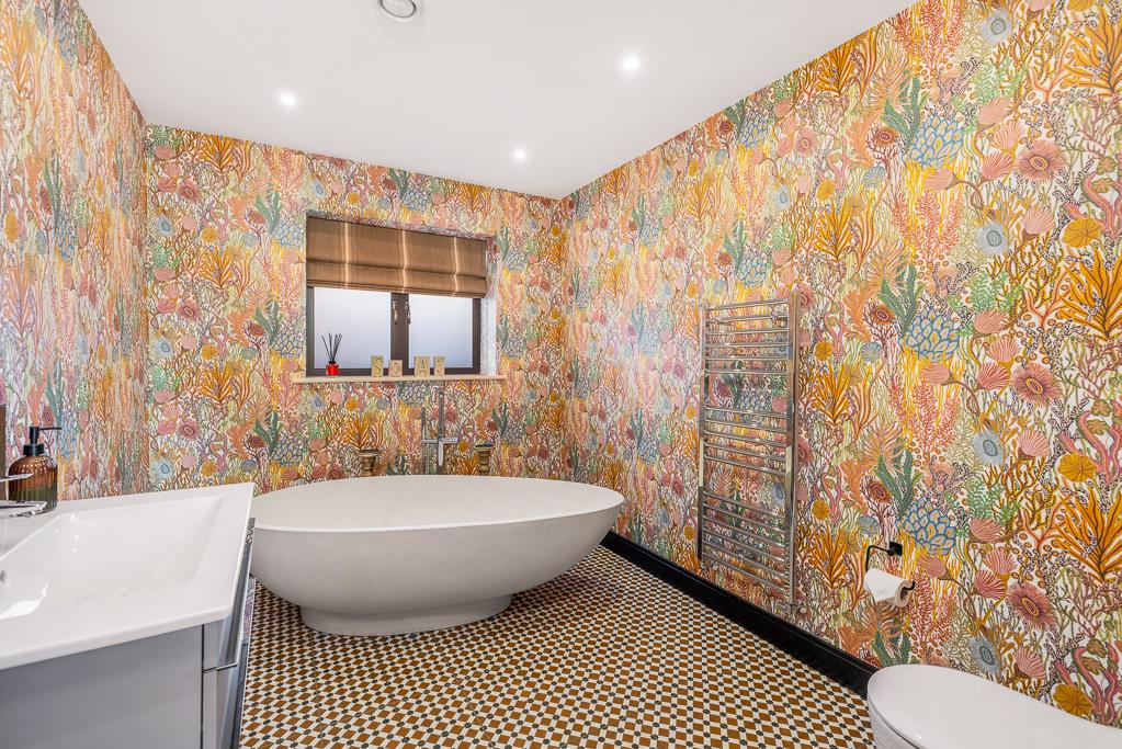 Underfloor heating runs through the entire home, complementing three well-proportioned bedrooms. The principal bedroom benefits from a sleek and contemporary en-suite shower room, while the remaining bedrooms are served by a standout family bathroom featuring an eye-catching stone egg-shaped freestanding bath.