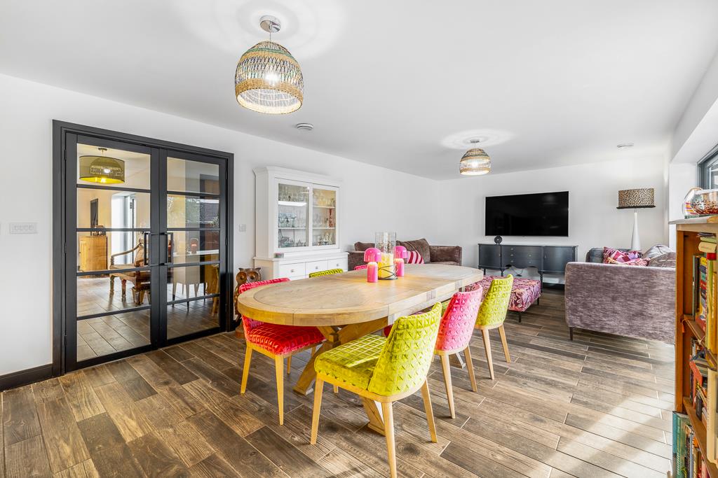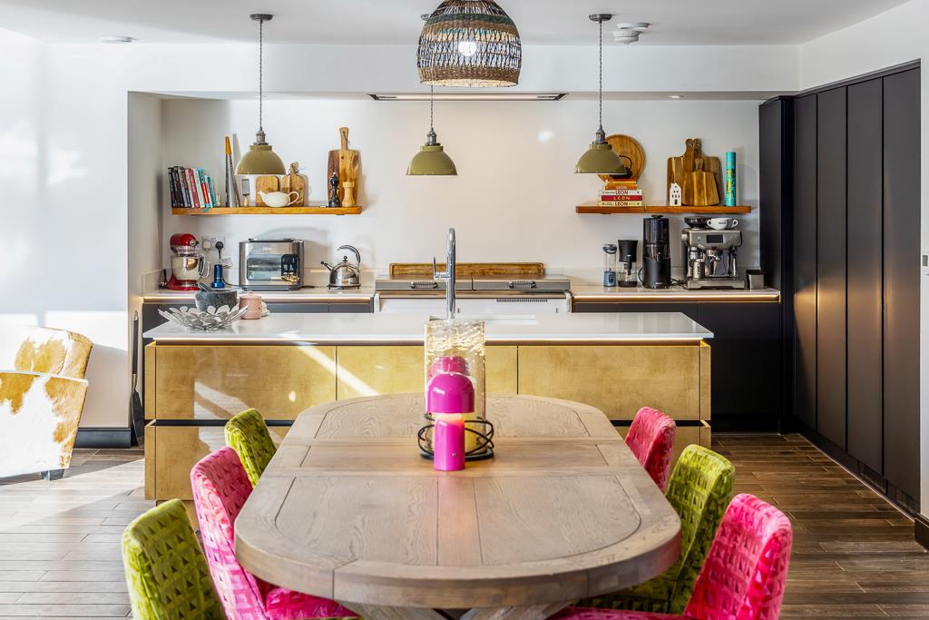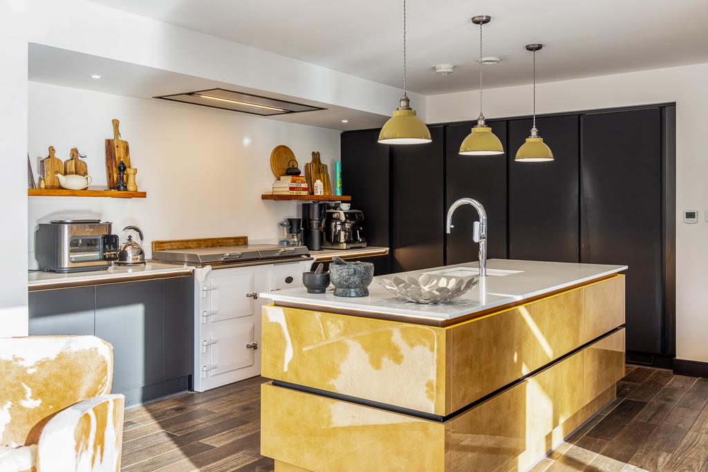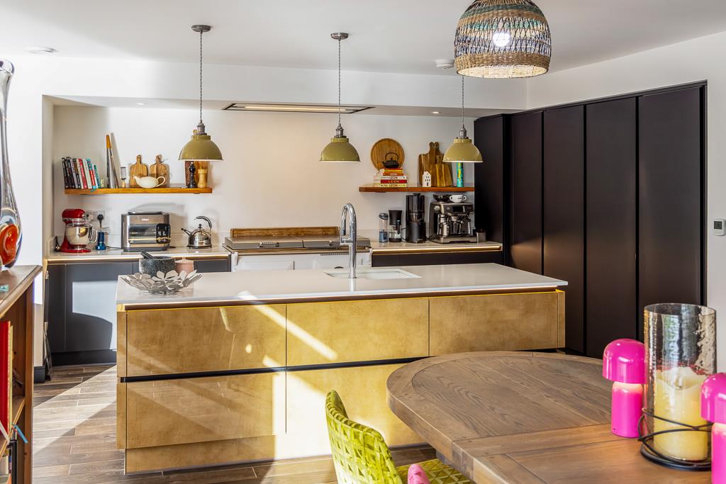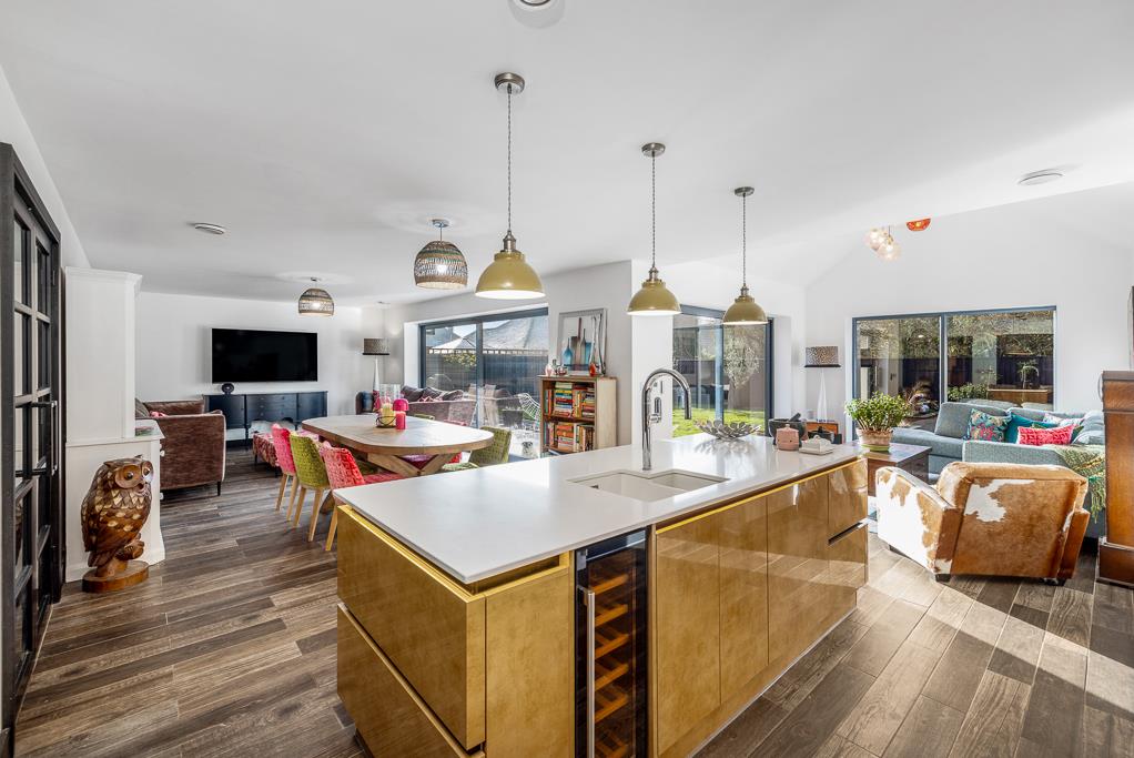 A practical utility room sits conveniently off the hallway before glass double doors open into the impressive open-plan living space. At the heart of this room is a stunning kitchen island, complete with high-end finishes and feature lighting, perfectly dividing the space into relaxing and entertaining zones. The island is generously sized yet fits the room effortlessly, creating a superb focal point.