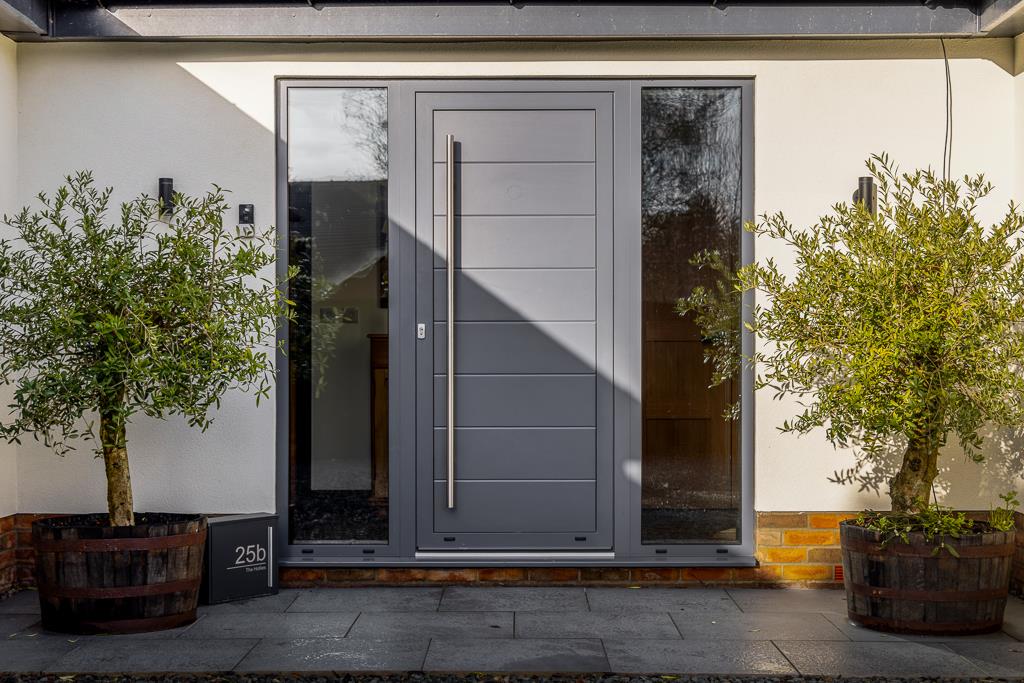 Aluminium, Dutemann Haus Venice, a high end contemporary aluminium front door, featuring a 44mm thick panel with modern aesthetics to front. Tiled flooring. Cupboard housing under floor heating controls, cylinder and water softener. Storage cupboard with shelving.