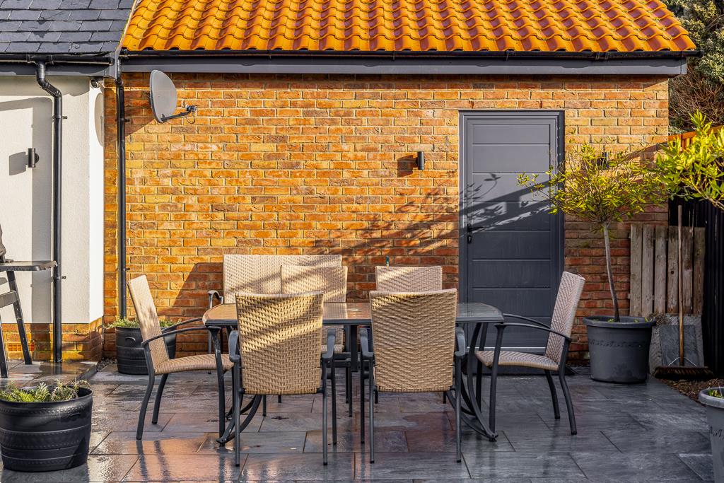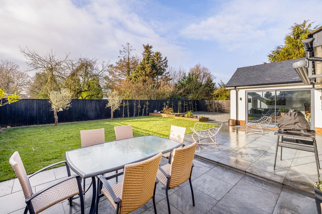 Outside, the south facing garden has been designed with low maintenance in mind, featuring an extended patio, newly laid lawn, and freshly planted trees and shrubs that will mature to provide privacy and shade. A large gravelled area runs along the side and rear of the property, offering discreet storage and refuse space away from the main garden.
